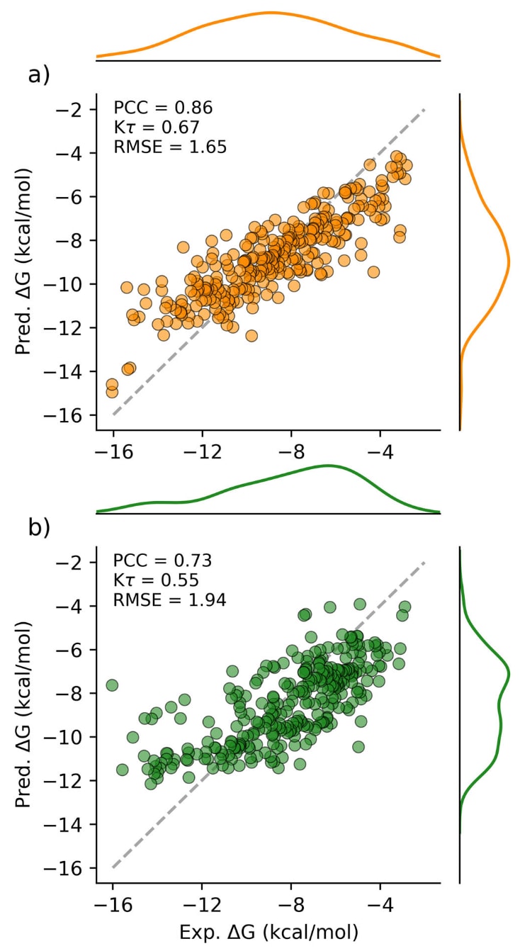 图2 | AEV-PLIG模型预测值与实验结合自由能的散点图。 a为使用PDBbind v2020训练并在CASF-2016基准上评估的模型,b为使用Refined2020+训练并在OOD Test基准上评估的模型。RMSE以kcal/mol表示。