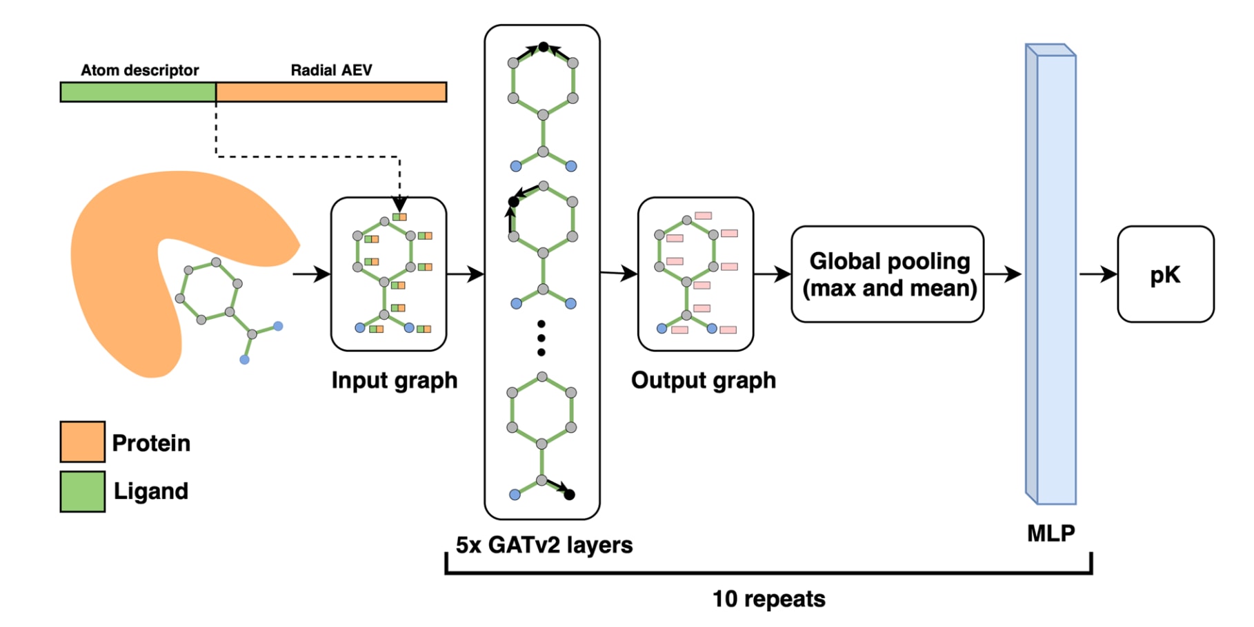 图1 | AEV-PLIG架构示意图。 输入的配体图以原子描述符与径向AEV构成节点特征向量,并依次经过五层GATv2传播,每层包含三个注意力头。随后对图进行全局池化,将max pooling与mean pooling的向量拼接后输入四层MLP。最终预测值由十个独立训练、结构相同但随机种子不同的模型输出均值计算得到。