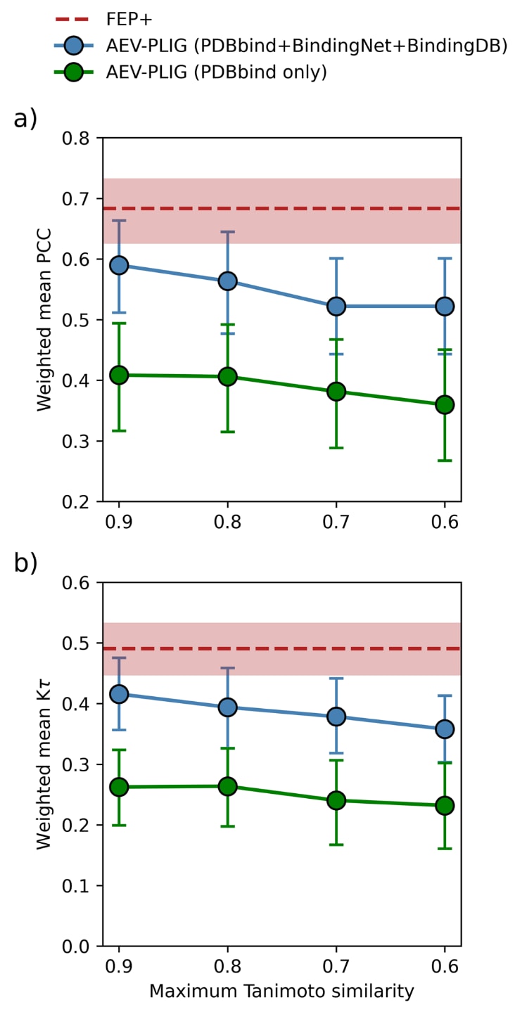 图3 | AEV-PLIG模型在FEP基准上的表现。 a为加权平均PCC,b为加权平均Kτ,纵轴为模型性能,横轴为训练集与测试集之间的配体Tanimoto相似度(Ts)上限。模型分别基于仅使用PDBbind v2020(绿色)或使用PDBbind v2020结合BindingNet与BindingDB-DCS进行训练。FEP+在FEP基准上的表现以红色显示。Tanimoto相似度基于ECFP6指纹计算,误差条表示95% BCa自举置信区间。