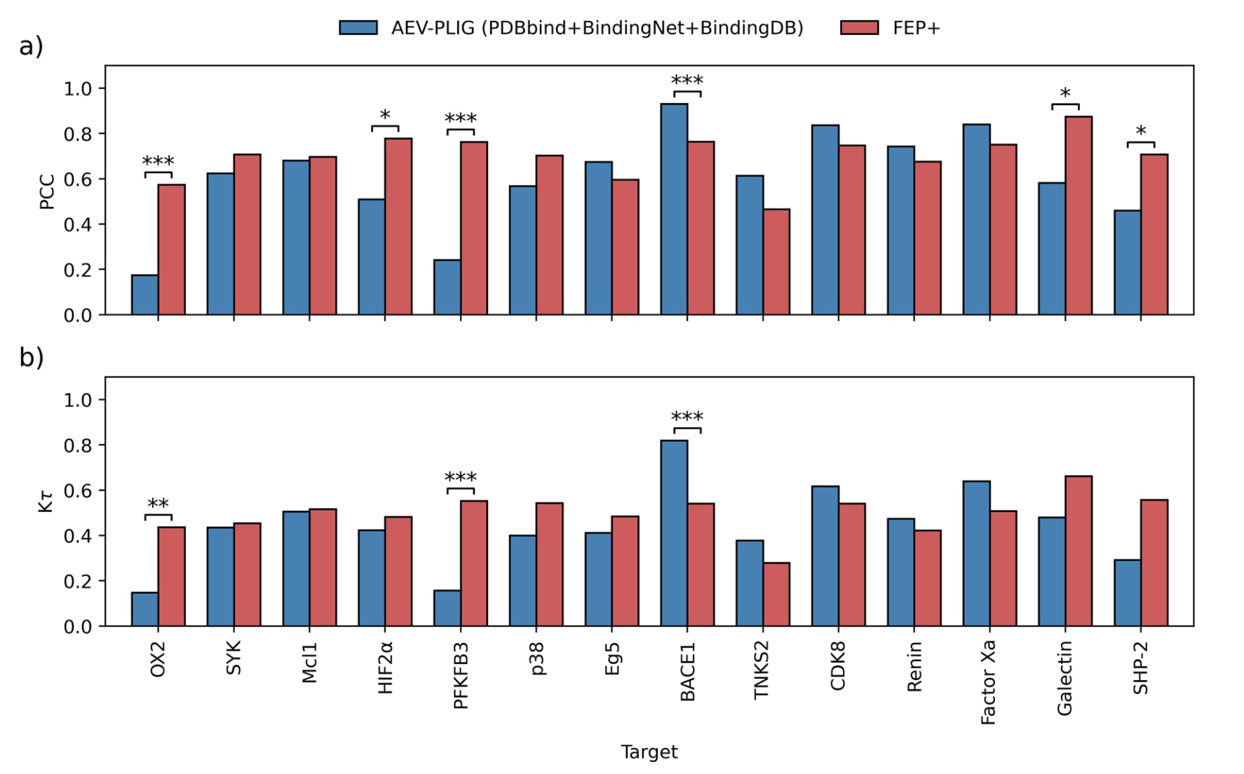 图 4 | FEP基准中包含25个及以上配体的靶点上,FEP+与AEV-PLIG模型的性能比较。 a为PCC,b为Kτ。AEV-PLIG模型基于PDBbind v2020、BindingNet与BindingDB-DCS数据训练(Ts ≤ 0.9)。为便于展示,未绘制误差条。星号表示两种方法之间存在统计学显著差异(*P < 0.05,**P < 0.01,***P < 0.001),其统计计算方式详见“Methods”。