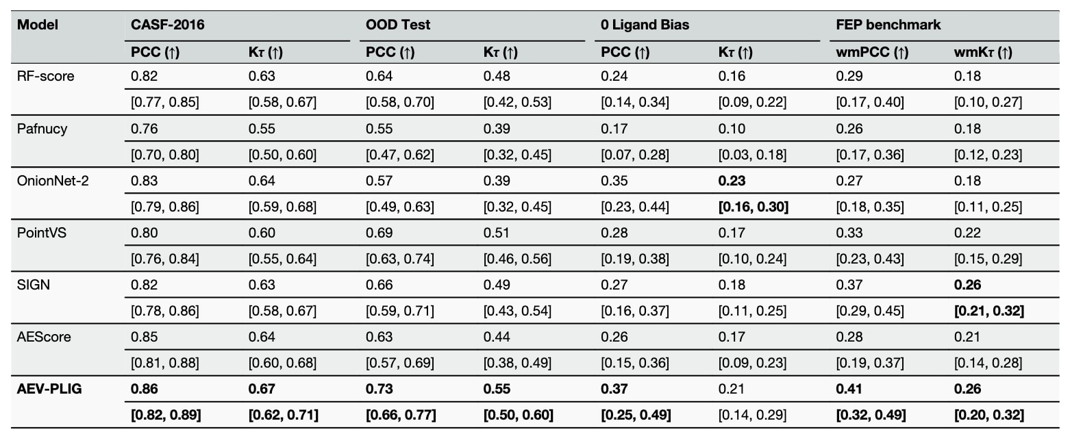 模型在OOD Test、CASF-2016以及一个用于自由能微扰(FEP)计算的基准测试集上均进行了系统评估。结果显示,AEV-PLIG性能具有竞争力,并在与物理学驱动方法的对比中实现更为现实、严谨的性能刻画。此外,通过利用模板建模或分子对接生成的增强数据,可显著提升在FEP基准上的亲和力预测相关性与排序能力,PCC和Kendall’s τ由0.41与0.26分别提升至0.59与0.42。