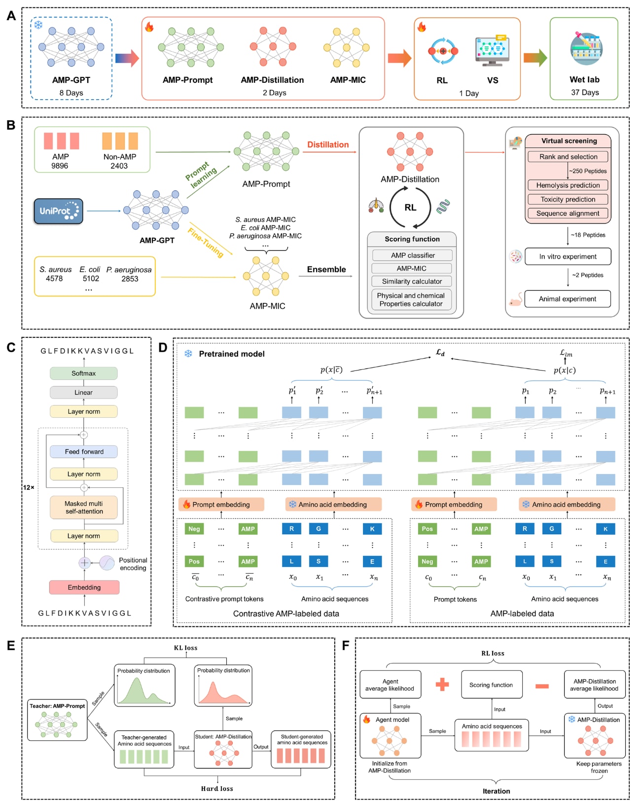 图1 | 展示了AMP-Designer的总体概览。 (A) 展示了利用AMP-Designer进行抗菌肽(AMP)筛选的时间线,包括计算设计、体外筛选及体内验证的完整流程。(B) 展示了AMP-Designer的工作流程(workflow),其中vS表示虚拟筛选(virtual screening)。流程依次包括序列数据准备、AMP-GPT基础模型训练、对比提示微调、模型蒸馏与强化学习优化等步骤。(C) 展示了AMP-GPT的模型结构,基于GPT框架构建的蛋白质语言模型,用于学习肽序列的分布与语义表示。(D) 展示了对比提示微调(contrastive prompt fine-tuning)过程,通过固定AMP-GPT参数,仅训练提示嵌入层以增强抗菌活性特征的可区分性。(E) 展示了模型蒸馏(model distillation)过程,将AMP-Prompt的知识压缩至更轻量的神经网络结构,以提高运算效率并保持生成能力。(F) 展示了强化学习(reinforcement learning, RL)优化过程,通过AMP-MIC预测模型反馈信号,对生成的序列进行活性打分与筛选,从而优化模型生成高活性AMP候选物的能力。