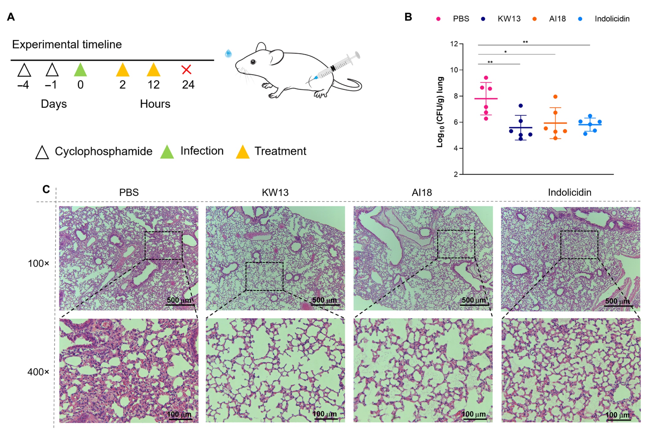 研究者进一步在由广耐药(XDR)Klebsiella pneumoniae 325016感染构建的小鼠肺炎模型中验证KW13与AI18的治疗效果。由碳青霉烯耐药K. pneumoniae引起的医院获得性肺炎是临床严重问题,治疗困难且死亡率高。抗菌肽(AMP)被认为是治疗肺部感染的潜在抗生素替代方案。