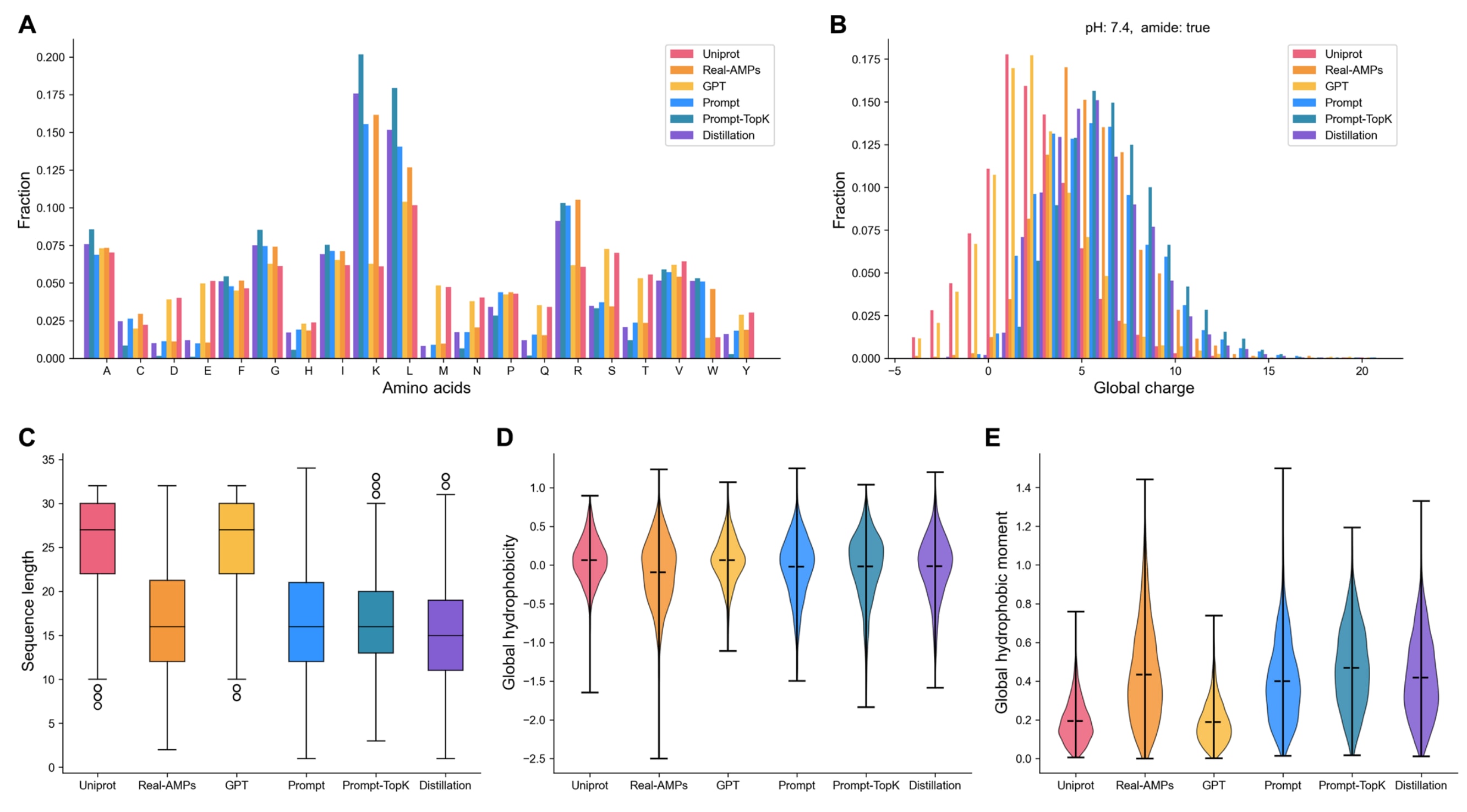 图2 | 展示了不同数据来源与模型生成肽序列在理化性质上的分布对比。 红色表示UniProt数据集,橙色表示真实抗菌肽(AMPs),黄色表示基础模型AMP-GPT,蓝色表示经对比提示微调后的AMP-Prompt,绿色表示采用top-k采样的AMP-Prompt-topK,紫色表示蒸馏模型AMP-Distillation。(A) 氨基酸组成分布;(B) 全局电荷(global charge)分布;(C) 序列长度(sequence length)分布;(D) Eisenberg疏水性(hydrophobicity)分布;(E) Eisenberg疏水矩(hydrophobic moment)分布。从结果可以看出,AMP-GPT生成序列的理化性质分布与UniProt数据集接近,说明模型成功学习了通用肽的统计特征;经对比提示学习与top-k采样后,AMP-Prompt与AMP-Prompt-topK生成的序列在电荷、疏水性与疏水矩等关键特征上更接近真实AMPs。蒸馏模型AMP-Distillation的分布与教师模型几乎一致,表明其充分继承了生成模型的理化属性分布与生成能力。