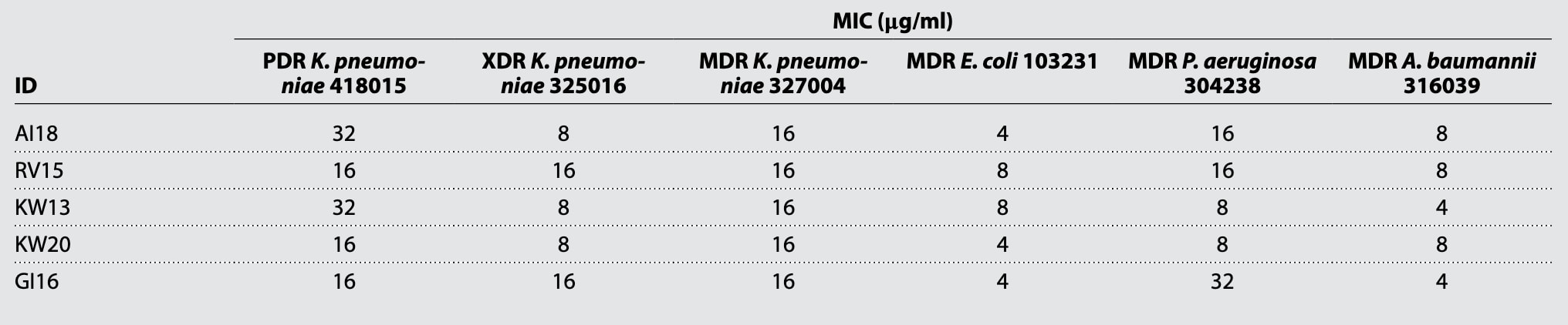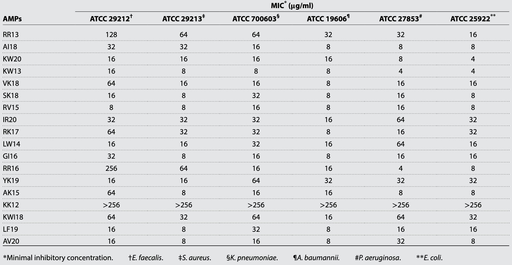 表3 | 前18条候选抗菌肽(AMP)对六种标准ESKAPE菌株的体外抗菌活性。