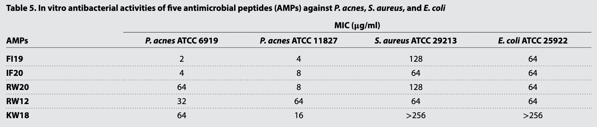 表5 | 五种抗菌肽(AMP)对P. acnes、S. aureus和E. coli的体外抗菌活性。