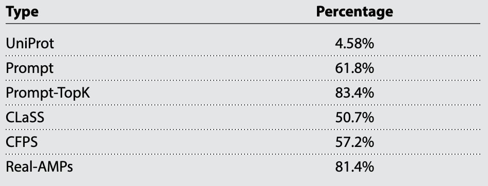 表1 | 显示了由三种预测器(CAMP、AMP Scanner 和 Macrel)同时判定为抗菌肽(AMP)的序列比例。 结果表明,CLaSS模型的比例为50.7%,CFPS为57.2%,而AMP-Designer方法显著更高,达到83.4%,相较CFPS提升了26.2%,体现出其在生成高活性抗菌肽方面的显著优势。