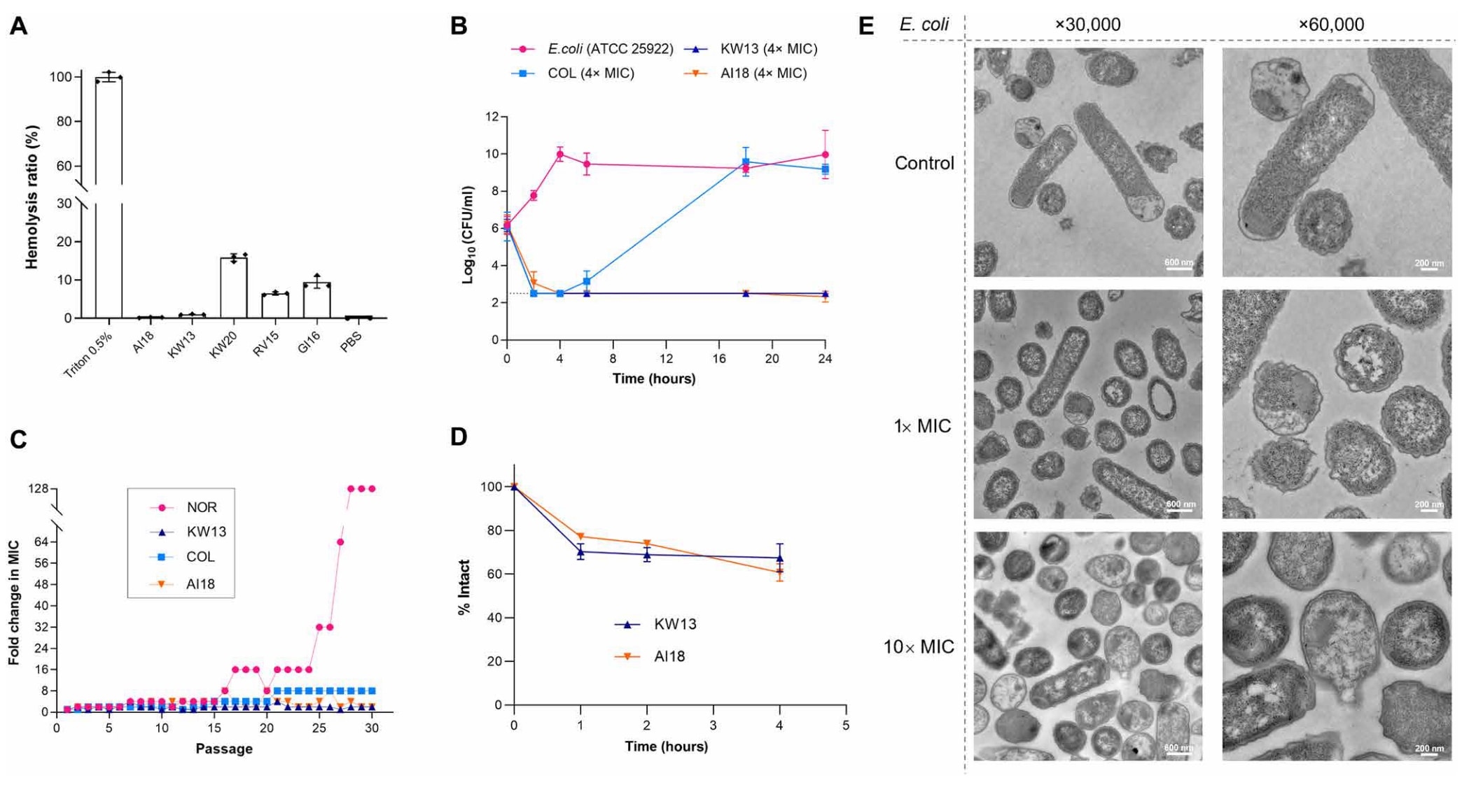 图4 | 展示了筛选出的抗菌肽(AMP)在体外的生物学性质。 (A) KW13、AI18、KW20、RV15与GI16在100 μg/ml浓度下的人红细胞溶血活性测试结果(n = 3个生物学独立重复,数据以平均值 ± 标准差表示)。(B) KW13与AI18的时间杀菌曲线,以黏菌素(COL)作为阳性对照(n = 3个生物学独立重复,平均值 ± 标准差)。(C) E. coli ATCC 25922在亚MIC浓度(1/2×)下与KW13、AI18共培养的耐药性诱导实验结果,以诺氟沙星(NOR)与黏菌素(COL)为阳性对照。(D) KW13与AI18的人血浆稳定性测试结果,采用高效液相色谱(HPLC)分析,数据以平均值 ± 标准差表示(n = 3个生物学独立重复)。(E) E. coli细胞经KW13与PBS(对照)处理后的透射电子显微镜(TEM)图像。放大倍数分别为×30,000(比例尺600 nm)与×60,000(比例尺200 nm)。