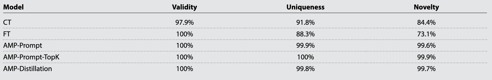 为进一步评估AMP-Designer生成肽序列的有效性、多样性与新颖性,研究者将其与两种基线方法进行了比较:条件标记(Conditional Token, CT)模型与全模型微调(Full Fine-Tuning, FT)模型。CT方法通过在标注数据上重新训练模型,在训练与生成阶段均输入属性标签,以自回归方式生成完整肽序列;传统FT方法则直接在真实AMP数据集上对AMP-GPT模型进行全参数微调。相关细节见方法部分“CT与FT模型”章节。