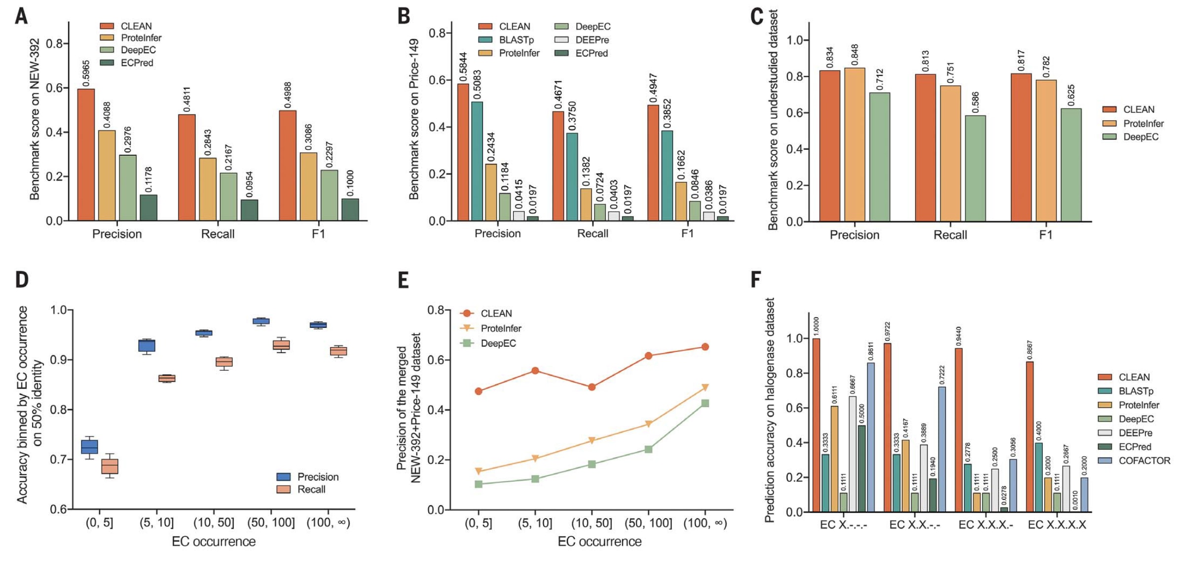 图2 | 展示了CLEAN与多种先进EC编号预测工具的定量比较结果。 (A) 在New-392数据库上评估了CLEAN在三项多标签准确性指标(精确率、召回率与F1得分)上的表现。对比模型包括ProteInfer、DeepEC、CatFam与ECPred四种表现最优的工具。结果显示,CLEAN在所有指标上均取得最高值。(B) 在Price-149数据库上比较了CLEAN与BLASTp、ProteInfer、DeepEC、DEEPre、CatFam及ECPred的表现。CLEAN在该实验中同样获得最高的F1分数,显著优于所有对比模型。(C) 针对稀有EC编号数据集,比较了CLEAN、ProteInfer与DeepEC三种模型的预测性能。CLEAN在处理低样本、分布不均的EC编号时依然保持最优表现。(D) 显示了CLEAN在与训练集序列同一性低于50%的测试集上的准确度分布图。采用SupconH损失函数训练后,精确率与召回率按EC编号在训练集中的出现次数分箱统计。例如区间(0,5]表示该EC编号在训练集中出现次数少于5次。箱线图展示了五折交叉验证的结果,表明CLEAN在低样本区间仍保持稳定性能。(E) 将Price-149与New-392数据集合并后,依据EC编号在CLEAN训练集中的出现次数分箱,对整体准确性进行评估。结果表明,CLEAN在预测少样本EC编号时依旧具有显著优势,而其他模型对高频EC编号表现出明显偏倚。(F) 展示了CLEAN在自建卤素化酶数据集上的预测准确率,并与六种常用工具(BLASTp、ProteInfer、DeepEC、DEEPre、ECPred与COFACTOR)进行比较。该数据集具有良好的多样性,涵盖11个不同EC编号。CLEAN在此数据集中同样表现最佳,进一步验证了其在实际酶功能预测中的广泛适用性与高可靠性。