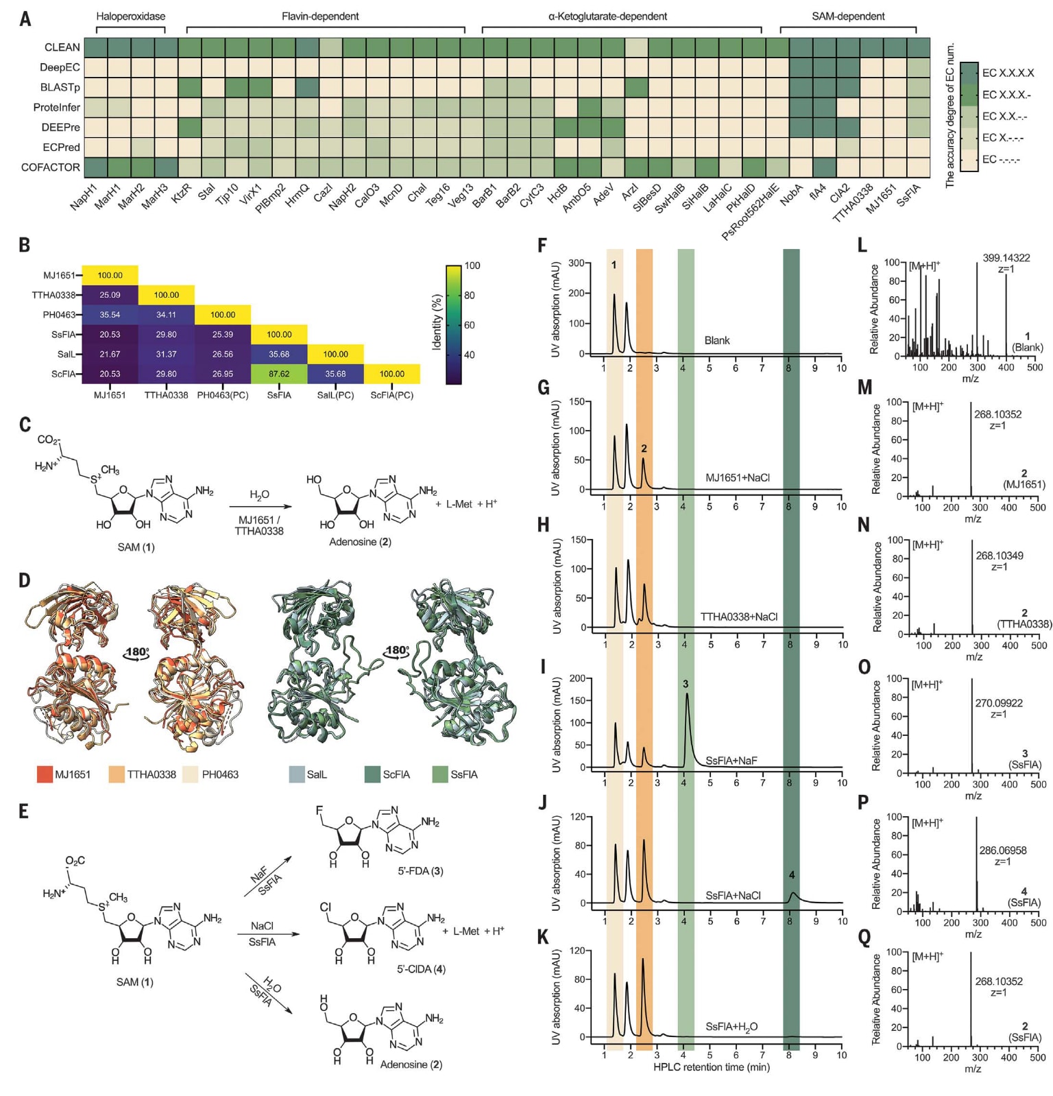 图3 | 展示了CLEAN在未表征卤素化酶(halogenases)中的实验验证结果。 (A) 显示了36种已鉴定卤素化酶的EC编号预测准确度热图。色块的深浅反映了模型预测与实际功能的一致程度。(B) 展示了这些未表征蛋白质与阳性对照(PC)酶之间的序列同一性热图,颜色条采用“viridis”色标,颜色深浅代表同源性百分比。(C) SAM羟基腺苷转移酶MJ1651–TTHA0338催化反应示意图。(D) 未表征蛋白MJ1651 [PDB ID: 2F4N]、TTHA0338 [PDB ID: 2CW5]与阳性对照酶PH0463 [PDB ID: 1WU8]的三维结构叠合图。同时也展示了SsFlA [PDB ID: 5B6I]、SalL [PDB ID: 2Q6O]与ScFlA [PDB ID: 1RQR]的结构叠合结果。可以看出,这些SAM结合型酶的三维结构高度相似,但CLEAN仍能准确区分其功能。每个晶体结构中均选取链A用于叠合。(E) 展示了SAM在SsFlA催化下与卤化物离子或H₂O发生亲核取代反应的过程。(F–K) 展示了SAM与NaCl/NaF/H₂O反应混合物的高效液相色谱(HPLC)分析结果。分别包括空白对照(F)、纯化的MJ1651(G)、纯化的TTHA0338(H)以及纯化的SsFlA[(I)–(K)]。图中标注了底物SAM(1)、产物腺苷(2)、5′-氟-5′-脱氧腺苷(5′-FDA)(3)与5′-氯-5′-脱氧腺苷(5′-ClDA)(4)的峰位,分别以浅黄、橙色、绿色与深绿色标识,并在相同保留时间处对齐。UV表示紫外检测信号,mAU为毫吸光单位。(L–Q) 展示了反应混合物中产物的质谱结果:空白体系中的底物1(L)、MJ1651催化反应产物腺苷(2)(M)、TTHA0338催化反应产物腺苷(2)(N)、5′-FDA(3)(O)、5′-ClDA(4)(P)以及腺苷(2)(Q)。m/z表示质荷比。这些实验验证表明,尽管未表征的SAM结合酶在结构上高度相似,CLEAN仍能精确区分其催化功能,进一步证实了其在功能注释上的可靠性与灵敏度。