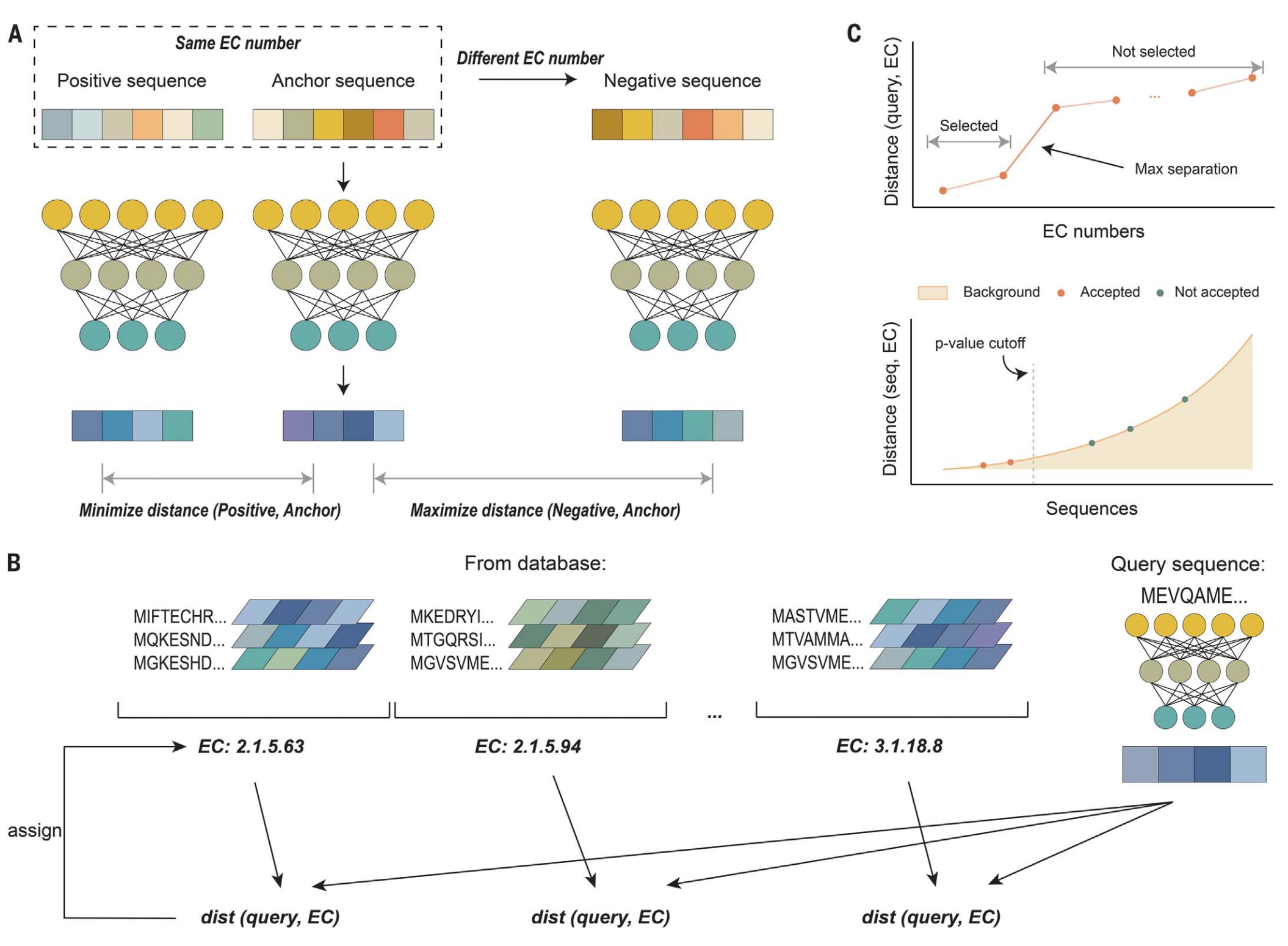 酶功能注释是生物信息学中的核心难题,虽然已有众多计算工具被开发出来,但大多数工具仍难以准确预测那些研究较少、功能未知或具有多重活性的蛋白质的功能注释,如酶委员会(Enzyme Commission,EC)编号。研究者提出了一种名为CLEAN(Contrastive Learning–Enabled Enzyme Annotation,对比学习驱动的酶注释)的机器学习算法,与当前最先进的工具BLASTp相比,该方法在准确性、可靠性和灵敏度上均有显著提升。对比学习框架使CLEAN能够自信地实现三项关键功能:(i)为研究不足的酶进行注释;(ii)纠正错误标注的酶;(iii)识别具有两种或以上EC编号的多功能酶。通过系统的计算实验与体外实验,研究者验证了这些能力。该工具有望广泛应用于未知酶功能的预测,从而推动基因组学、合成生物学以及生物催化等多个领域的发展。