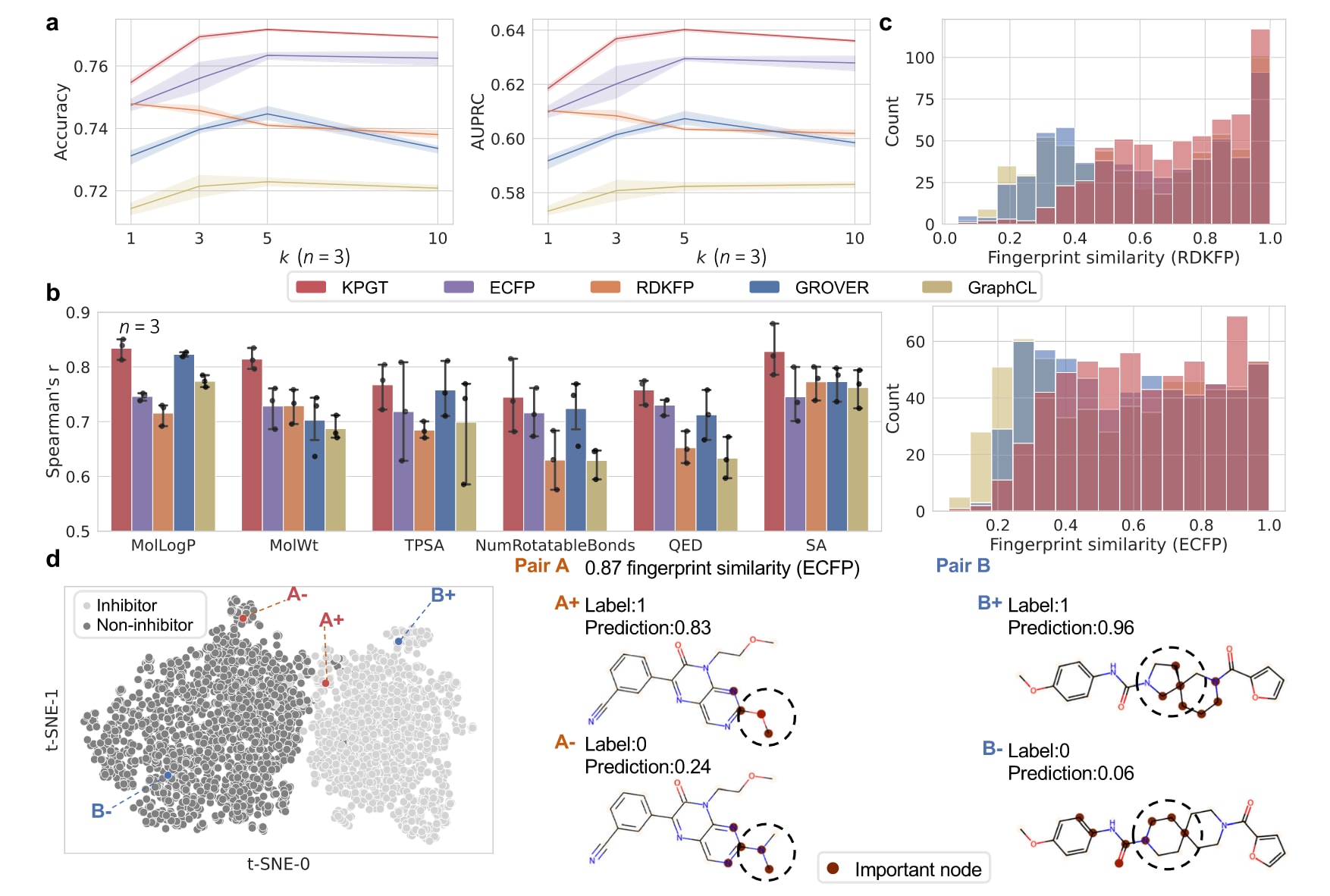 研究团队首先使用预训练好的KPGT为这些分子生成神经指纹(neural fingerprints,即分子特征表示)。随后,从CYP3A4数据集中随机抽取200个分子作为测试集,剩余分子作为训练集。基于这些神经指纹构建 k 近邻分类器(kNN),对测试集中分子的活性进行预测。然后,将KPGT的表现与两种经典指纹(扩展连通性指纹 ECFP、RDKit指纹 RDKFP)以及两个来自最新自监督方法(GROVER 和 GraphCL)的神经指纹进行比较。图 3a 给出了基于准确率和AUPRC(Precision-Recall 曲线下面积)的对比结果。可以看到,KPGT在AUPRC上比基线方法高出1.3%–2.7%。这说明,在KPGT学到的潜在空间中,相邻的分子更倾向于具有相似的性质。