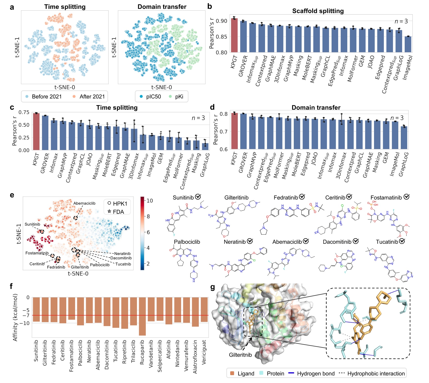 图4 | 展示了利用KPGT识别HPK1抑制剂。 a 在时间划分和域迁移两种场景下,基于t-SNE对分子ECFP进行可视化。b–d KPGT及各基线方法在三种不同数据划分场景下预测HPK1抑制剂的性能:b骨架划分(scaffold splitting)、c时间划分(time splitting)、d域迁移(domain transfer),评价指标为Pearson相关系数(Pearson’s r)。所有结果均基于三次独立重复实验,数据以均值±标准差(mean±SD)形式给出。e 基于KPGT得到的HPK1 pIC50数据集与FDA数据集的分子表征的可视化。图中虚线圈出的是KPGT从FDA数据集中预测出的对HPK1最有潜力的前十个候选抑制剂,其对应的分子结构示于右侧面板。对号符号表示这些分子已在既有研究中被报道为HPK1抑制剂。f KPGT识别出的前20个潜在HPK1抑制剂分子的分子对接打分,基于Autodock Vina计算。g 利用PLIP分析的配体gilteritinib与HPK1之间的相互作用。用于确定结合口袋的参考蛋白-配体结构为PDB编号7SIU。图中红色虚线位于−7 kcal/mol处,表示常用的“药物样分子具有良好结合潜力”的能量阈值。