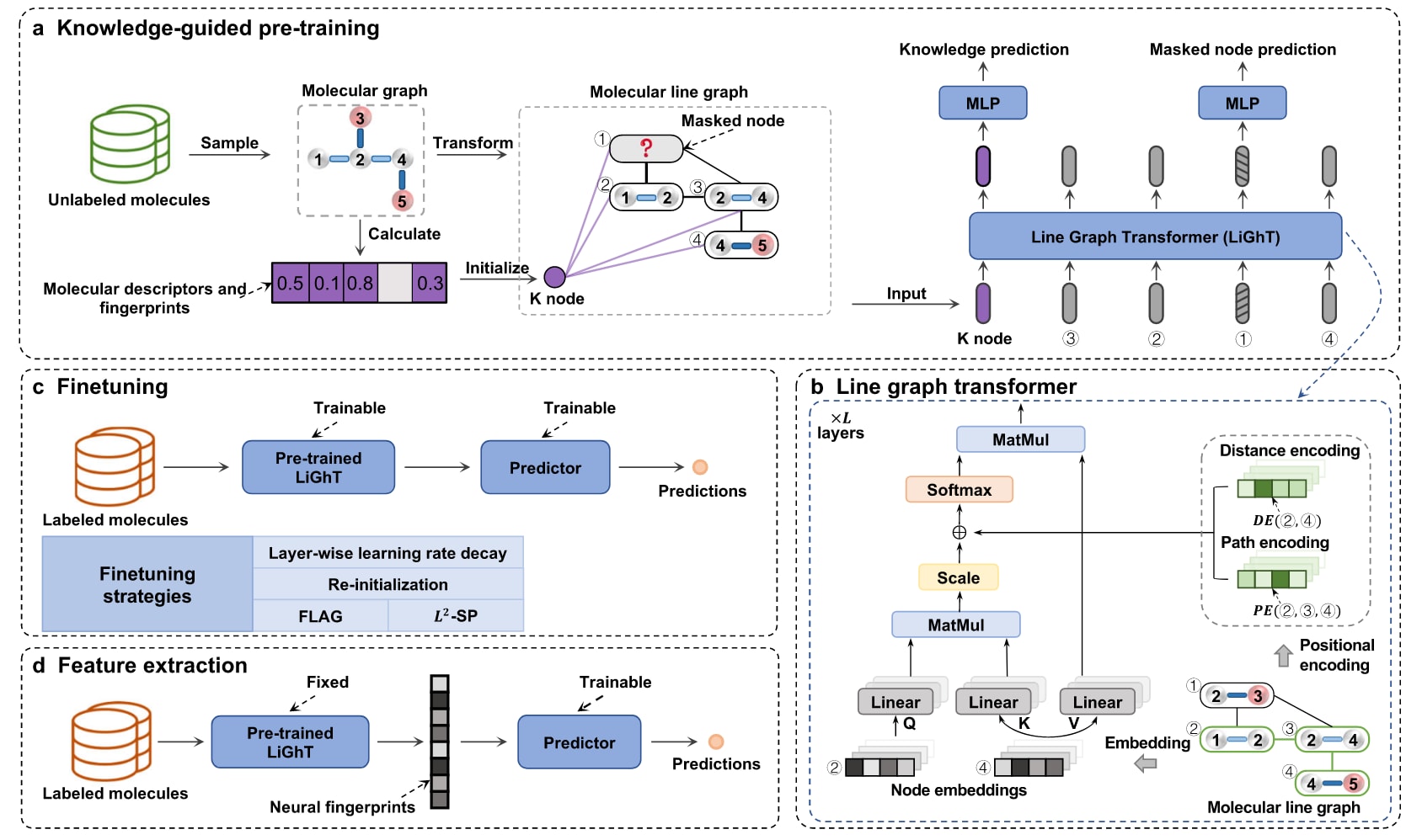 图1 | 展示了KPGT的总体概览。 a 基于掩码图模型、并引入额外知识增强的知识引导预训练策略。分子被表示为分子线图(molecular line graphs),用于刻画原始分子图中边与边之间的相邻关系。b 基于经典Transformer架构的线图 Transformer。c 下游分子性质预测任务中的微调(finetuning)设置迁移学习,此时预训练好的 LiGhT 参数是可训练的。在该设置下,可以采用多种微调策略,例如分层学习率衰减(layer-wise learning rate decay)、重新初始化(re-initialization)、FLAG 和 L2-SP 等。d 下游分子性质预测任务中的特征提取(feature extraction)设置迁移学习,此时预训练好的 LiGhT 参数保持固定。这里的**神经指纹(neural fingerprints)**是指由预训练LiGhT生成的分子特征表示,作为信息丰富且具有区分度的分子表示。MLP表示多层感知机(multi-layer perceptron),Linear表示线性层(linear layer),MatMul表示矩阵乘法(matrix multiplication),DE表示距离编码(distance encoding)模块,PE表示路径编码(path encoding)模块。
