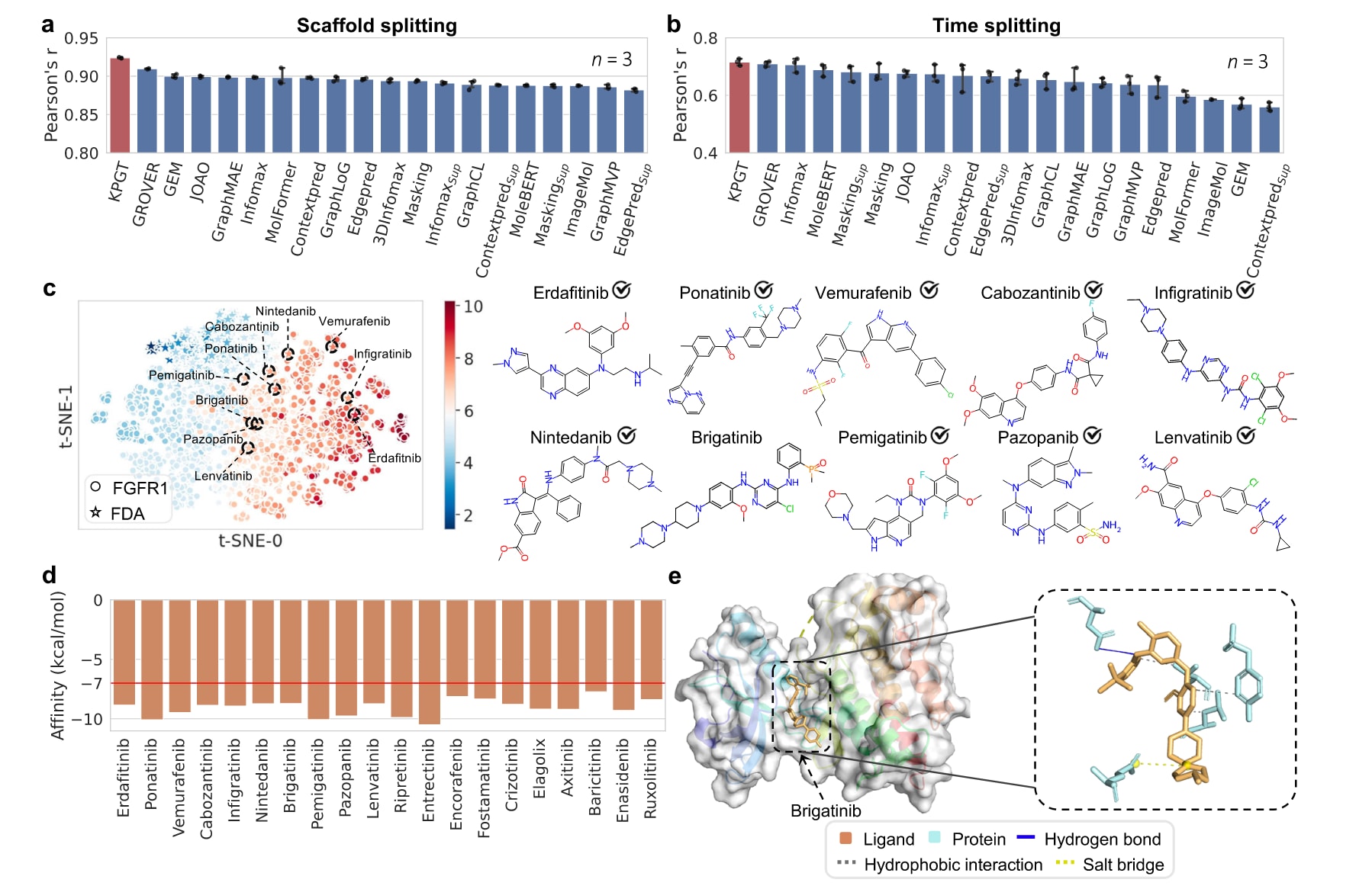 图5 | 展示了利用KPGT识别FGFR1抑制剂。 a, b KPGT及各基线方法在预测FGFR1抑制剂任务中的表现:a为骨架划分(scaffold splitting),b为时间划分(time splitting)场景,评价指标为Pearson相关系数(Pearson’s r)。所有结果均基于三次独立重复实验,数据以均值±标准差(mean±SD)形式给出。c 基于KPGT得到的FGFR1抑制剂pIC50数据集与FDA数据集分子表征的可视化。图中虚线圈出的是KPGT从FDA数据集中预测出的对FGFR1最有潜力的前十个候选抑制剂,其对应的分子结构示于右侧面板。对号符号表示这些分子已在既有研究中被报道为FGFR1抑制剂。d KPGT识别出的前20个潜在FGFR1抑制剂分子的分子对接打分,基于Autodock Vina计算。e 利用PLIP分析的配体brigatinib与FGFR1之间的相互作用。用于确定结合口袋的参考蛋白-配体结构为PDB编号5A4C。图中红色虚线位于−7 kcal/mol处,表示常用的“药物样分子具有良好结合潜力”的能量阈值。