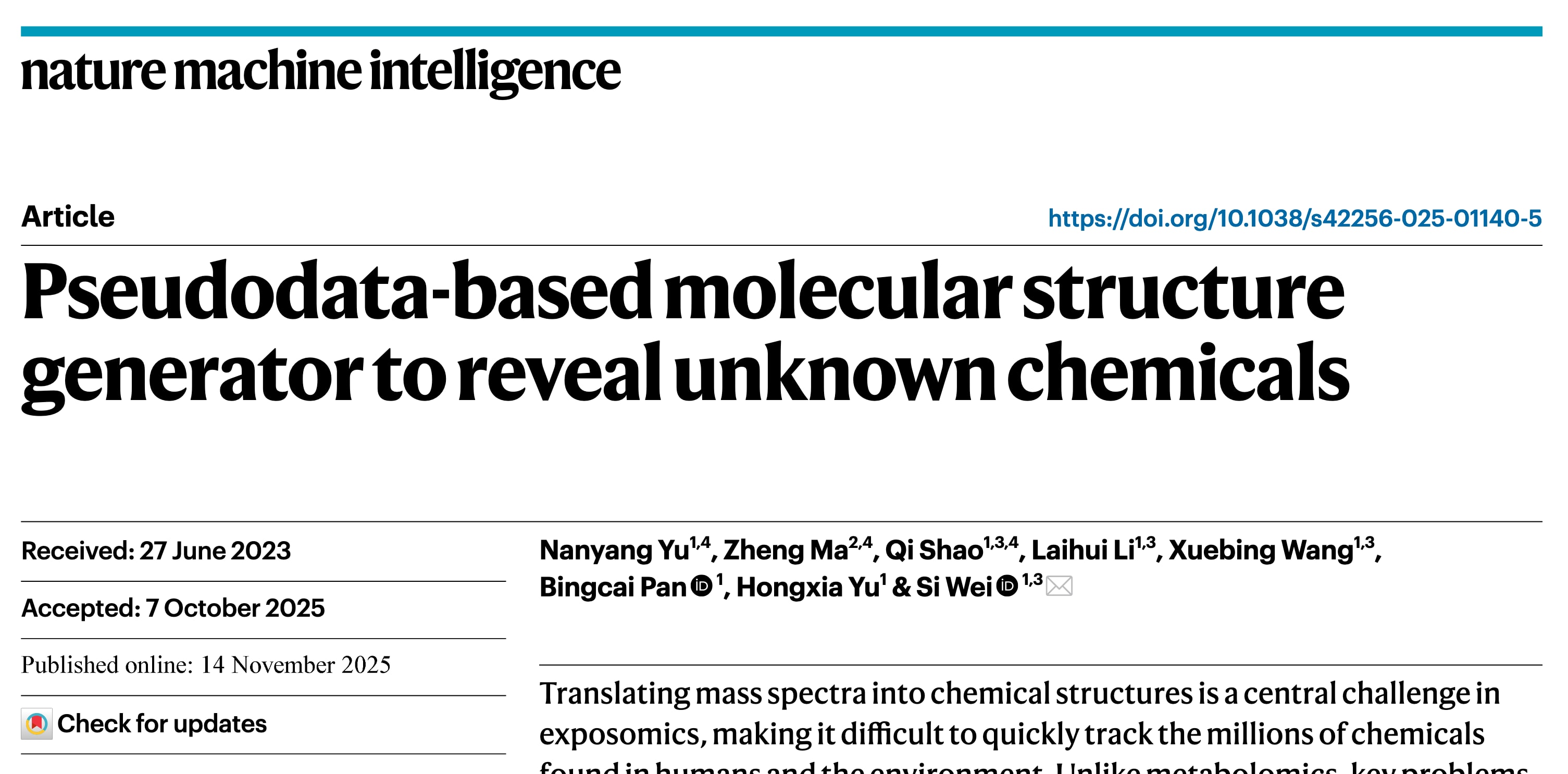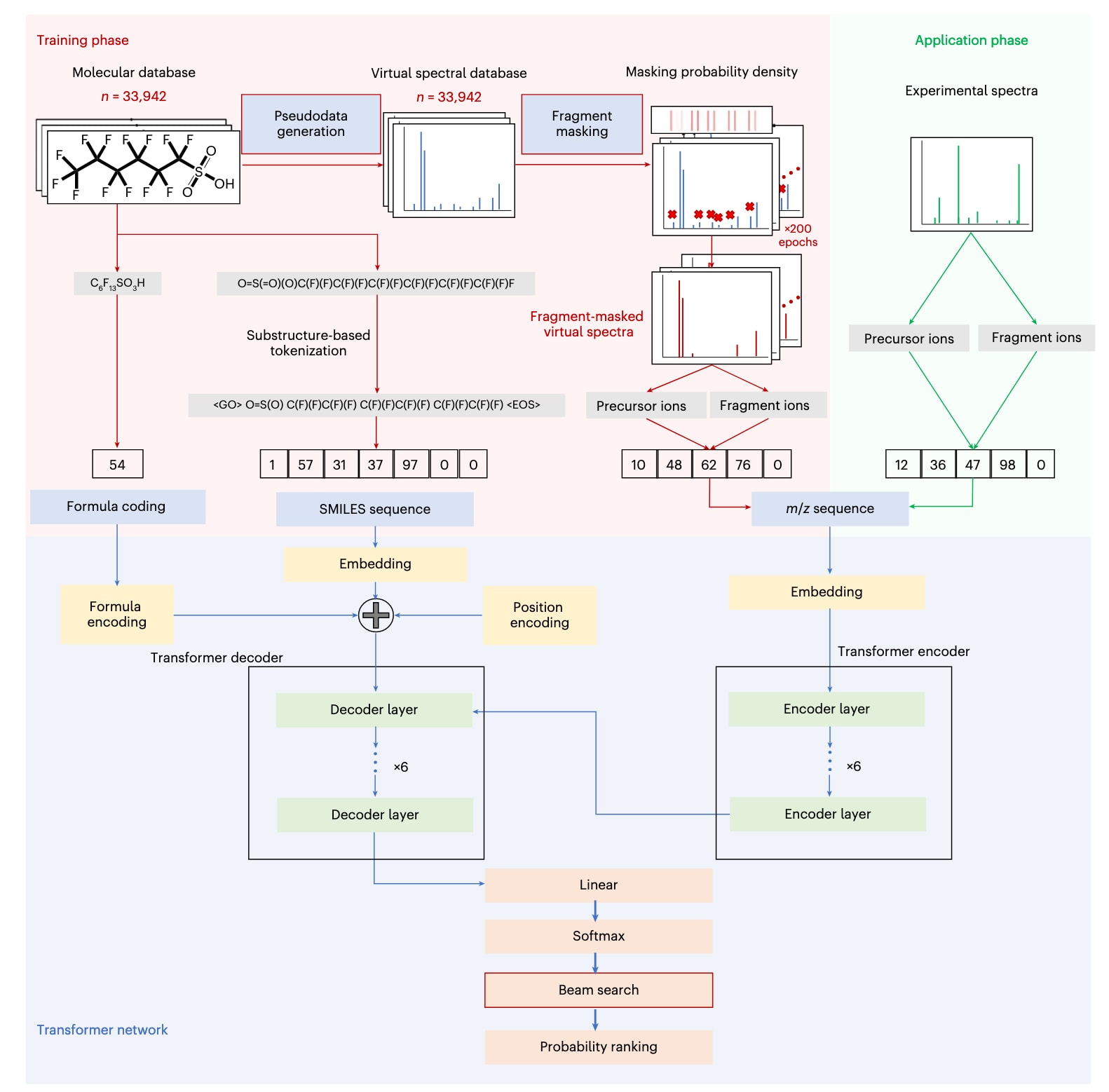 将质谱数据转译为化学结构是外暴露组学中的核心难题,使得快速追踪存在于人体与环境中的数百万种化学物变得十分困难。相较于代谢组学,更大分子空间的化学物在模型开发上面临数据稀缺、模型复杂性高以及查询策略难以制定等关键问题。该研究提出一种可直接由质谱生成分子结构的生成器MSGo,用于发现外暴露组中的未知多氟化学物。该方法通过变换器神经网络并仅利用虚拟质谱进行训练,在验证集中能够正确识别48%的结构;在从文献报道的废水样本中挖掘新的多氟化学物方面,其表现也优于专家。面向概率的虚拟质谱掩蔽策略是MSGo取得高性能的关键。借助MSGo等自动化工具,在实验质谱数据有限的情况下快速发现化学物,将成为应对当前未知多氟化学物危机的重要途径。