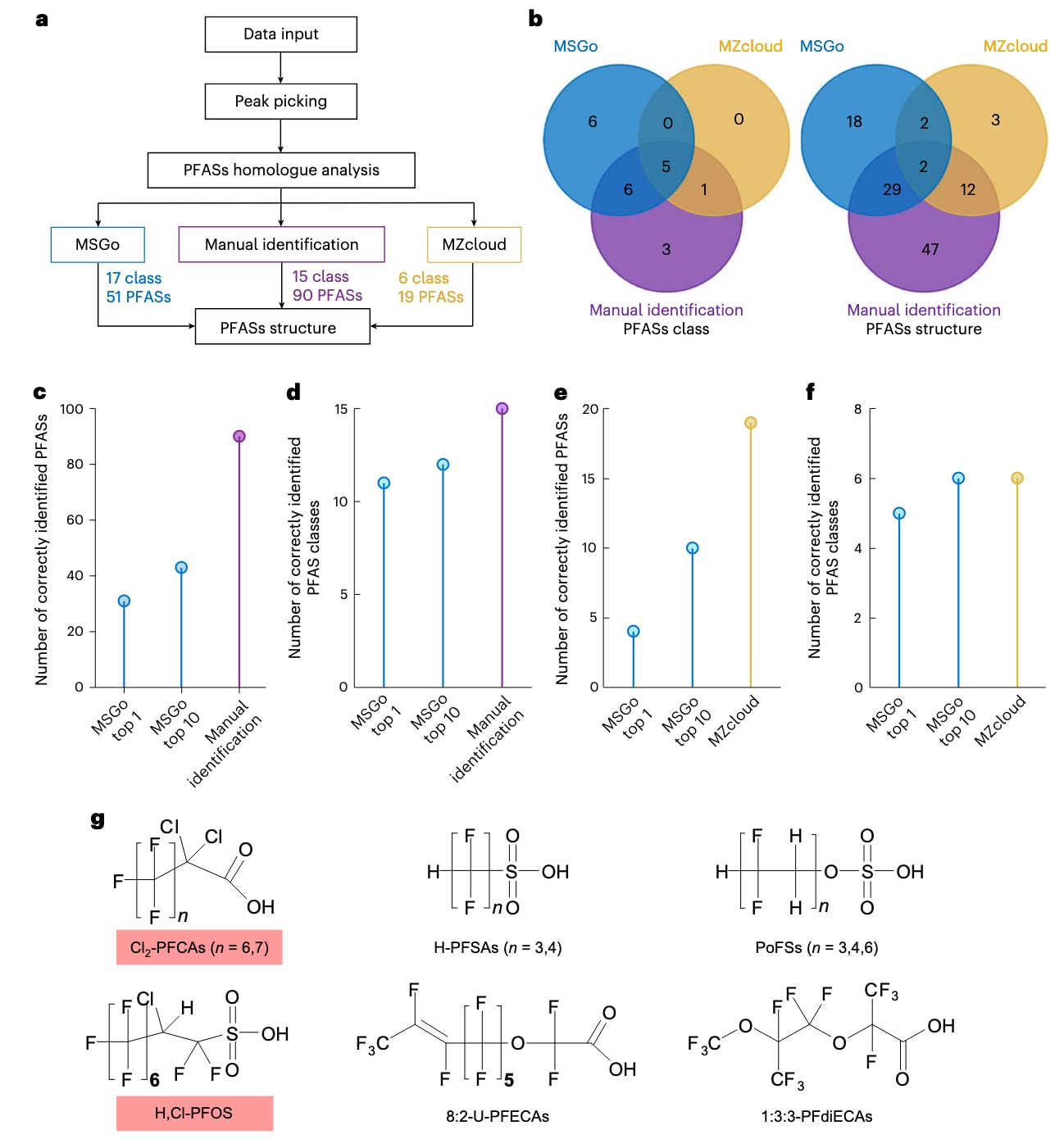图3|利用环境样本中的质谱数据验证MSGo的性能 a,基于文献报道的数据,对比MSGo、MZcloud与专家的分析流程。b,MSGo、MZcloud与人工鉴定三者在PFAS类别及结构层面的维恩图对比。c,在专家鉴定的90种PFAS中,MSGo在前1与前10候选结果中正确识别的数量。d,在专家鉴定的15类PFAS中,MSGo在前1与前10候选结果中正确识别的类别数量。e,在MZcloud标注的20种PFAS中,MSGo在前1与前10候选结果中正确识别的数量。f,在MZcloud标注的6类PFAS中,MSGo在前1与前10候选结果中正确识别的类别数量。g,MSGo基于文献数据识别出的新PFAS结构,其中首次注释的Cl2-PFCA及氯、氢取代的PFOS(H,Cl-PFOS)以标注方式突出显示。图中还包括H-PFSAs(氢取代全氟烷基磺酸盐)、PoFSs(多氟烷基硫酸酯)、8:2-U-PFECAs(8:2不饱和全氟烷基醚羧酸)与1:3:3-PFdiECAs(1:3:3全氟烷基二醚羧酸)。
