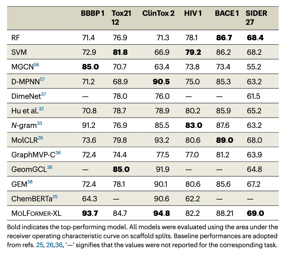 结果表明,MoLFormer学习到的分子表征能够准确捕捉充足的化学与结构信息,从而支持对多种性质的预测;其性能在多数任务上优于或不逊于那些直接利用精确图拓扑结构(甚至包括键长等3D几何信息)的先进GNN模型。