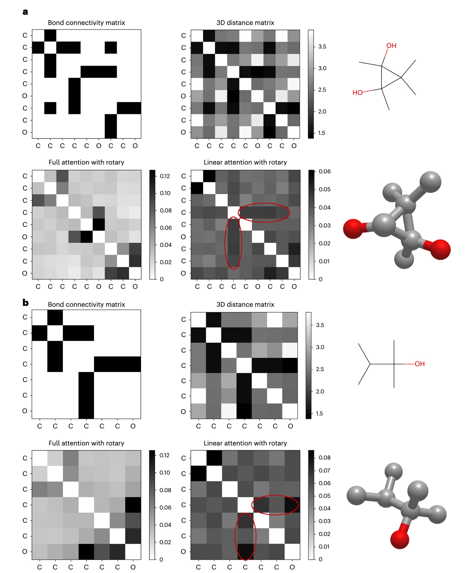 图3 | 展示了在旋转位置编码(rotary embedding)下,分别采用全注意力或线性注意力的MoLFormer,对两个随机分子“CC1(C)C(C)(O)C1(C)O”(a)和“CC(C)C(C)(C)O”(b)所学习到的注意力图以及对应的分子结构(键连接关系和单位为Å的三维距离)的可视化。 注意力图(取值范围0到1,仅为清晰起见保留映射到组成原子的token),由某一中间注意力层的多头注意力平均池化得到,体现了对共价键连接模式以及原子间长程空间关系的感知。其中,线性注意力版本对于中程三维距离的刻画(红色圆圈标出)优于全注意力版本。