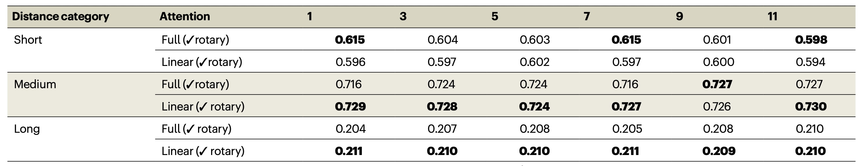 在分析中,该研究团队将原子对之间的空间距离分为三类:短距离(≤2 Å,主要对应典型的共价键,譬如C–C单键约为1.5 Å)、中等距离(2–4 Å)以及长距离(≥4 Å),并在表3中分别汇总了对应的注意力与距离相似性。结果显示,无论是采用线性注意力还是全注意力、并结合旋转位置编码的MoLFormer,其注意力模式在短距离和中等距离范围内都与真实的原子间距离具有较高相似度,而在长距离范围内相似性较弱(约0.2)。这一现象表明,MoLFormer能够在一定程度上捕捉分子内部原子之间的空间关系,即便这些原子在SMILES序列中并非相邻。与全注意力版本相比,MoLFormer-XL(线性注意力)在中长程(medium和long-range)距离上的相似性略高,说明线性注意力版本在建模原子间空间关系方面反而更加有效。