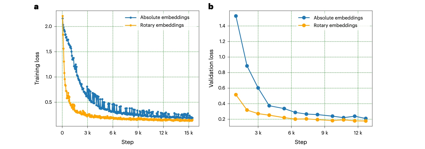 为了获得更好的上下文建模能力并提升训练效率,MoLFormer采用了旋转位置编码(rotary positional embedding)替代绝对位置编码,同时结合线性注意力机制(linear attention)(更多模型结构与训练细节见 Methods 和补充材料)。训练过程中可以观察到,相比绝对位置编码,使用旋转位置编码在预训练阶段带来了更稳定的训练表现和更快的loss收敛(见图2)。
