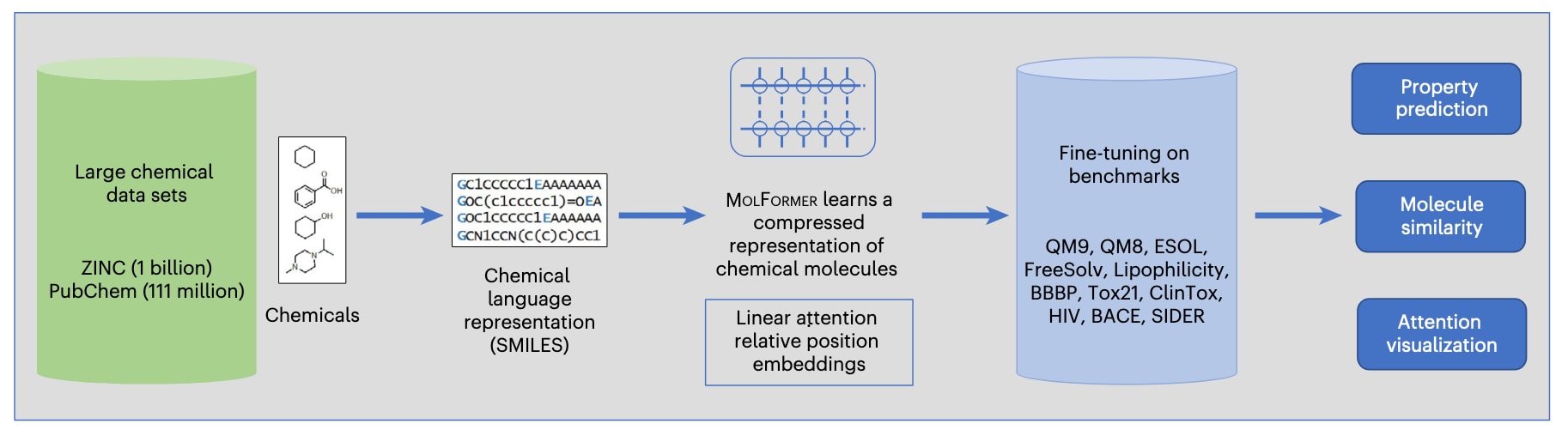 基于机器学习的模型可以实现快速而精确的分子性质预测,这对药物发现和材料设计具有重要意义。尽管已有多种监督学习模型取得了可观表现,但由于化学空间极其庞大、性质标注数据又十分有限,仅依赖监督学习依然面临巨大挑战。近几年,在大规模无标注语料上预训练的Transformer语言模型迅速发展,并在多种下游自然语言处理任务中取得了领先性能。受此启发,该研究提出了一种通过高效Transformer编码器模型MoLFormer学习分子表征的方法。MoLFormer采用旋转位置编码(rotary positional embeddings) 与线性注意力机制,并在PubChem与ZINC数据集中共约11亿个未标注分子的SMILES序列上进行高度并行的预训练。结果表明,相比现有的多种基线模型(包括监督和自监督的图神经网络以及分子语言模型),MoLFormer学到的分子表示在十个基准数据集中的多个下游任务上表现更优,在另外两个任务上也具备竞争力。进一步的分析,尤其是基于注意力权重的可视化,显示MoLFormer在化学SMILES上训练后,能够隐式地学习分子内部原子之间的空间关系。这些结果表明,大规模分子语言模型可以有效捕捉分子的化学与结构息,从而支持包括量子化学性质在内的多种分子性质预测。