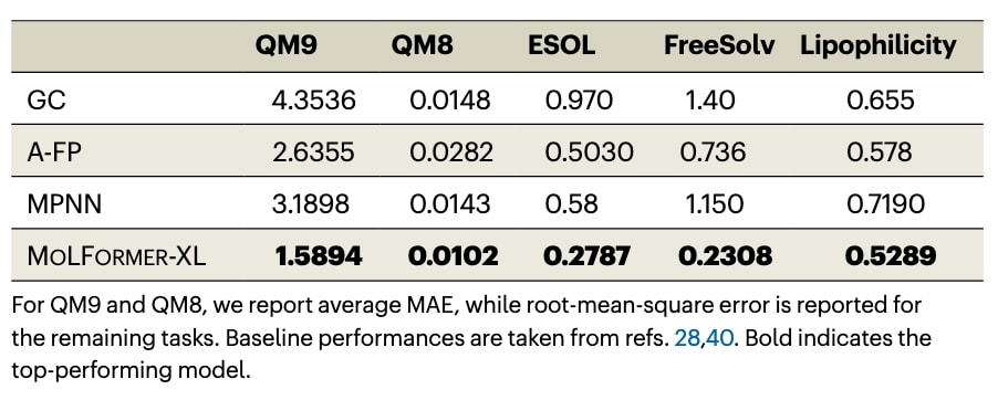 表2 | 展示了在QM9、QM8、ESOL、FreeSolv和Lipophilicity回归基准上,微调后的MoLFormer与其他监督式GNN基线模型的性能对比结果。