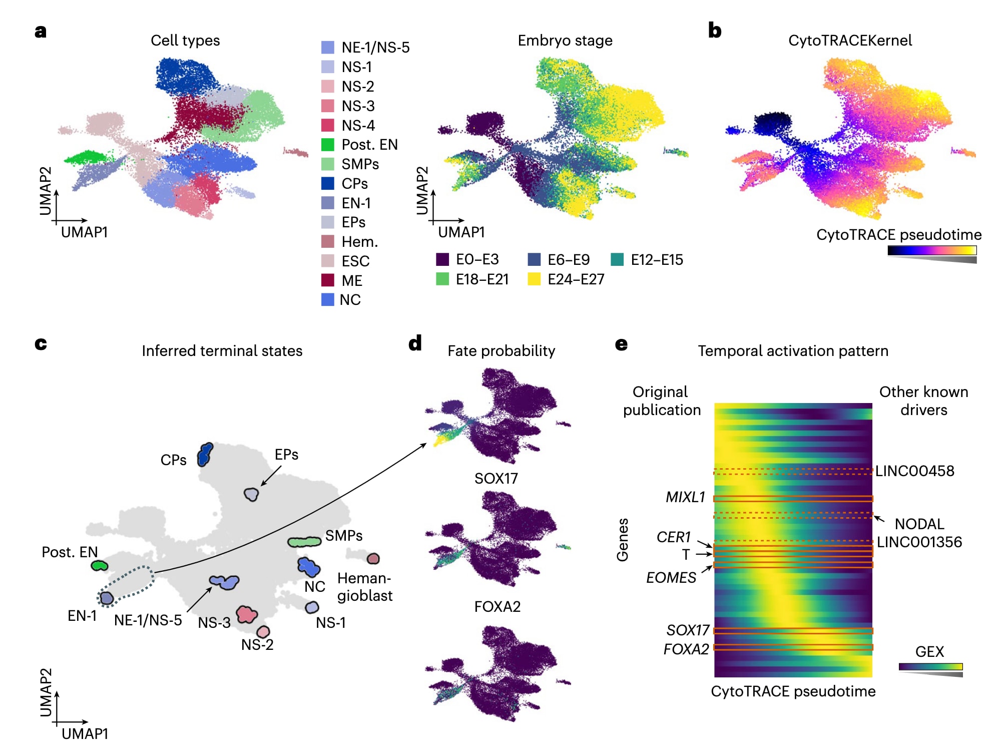 图3 | 展示了CytoTRACEKernel在恢复基因激活时间序列中的能力。 a与b部分为31,029个类胚体细胞的UMAP嵌入,分别按原始簇注释(包括心脏前体CPs、内胚层EN、心外膜前体EPs、胚胎干细胞ESC、血管母细胞Hem.、中胚层ME、神经嵴NC、神经外胚层NE、神经元亚型NS、后部内胚层Post. EN、平滑肌前体SMPs;a左图)、胚胎阶段(a右图)以及CytoTRACEKernel计算得到的伪时间(b)着色。c部分展示基于CytoTRACEKernel推断出的终末状态。d部分在UMAP上显示内胚层谱系的命运概率(上)与恢复出的驱动基因的表达量(下)。e部分展示沿CytoTRACE伪时间的前50个自动识别出的谱系相关基因的平滑表达趋势,并按照其在伪时间中的峰值排序。图中标出原始研究中报道的基因(左)以及CellRank 2额外恢复的已知驱动基因(右)。