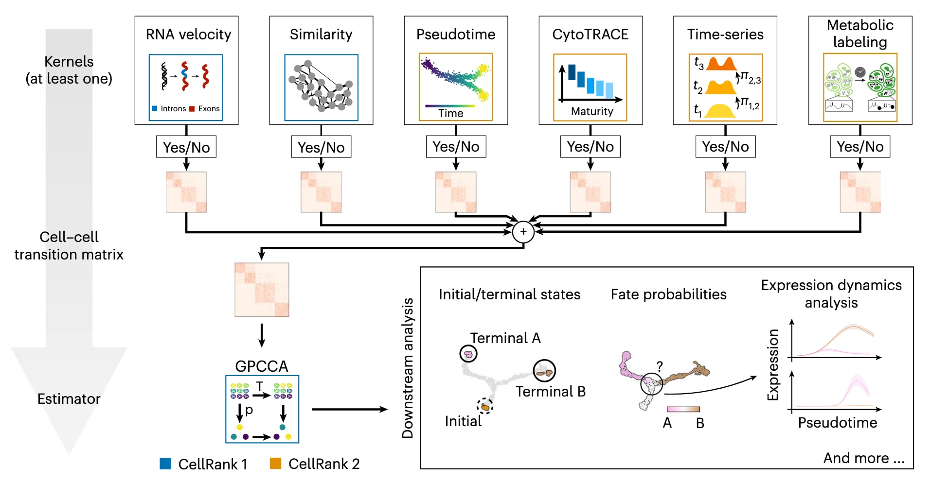 图1 | 展示了CellRank 2如何通过马尔可夫链提供一个统一框架,用于研究单细胞命运决策。 CellRank 2采用模块化设计。数据与问题特定的核函数用于计算细胞间的转移矩阵,从而诱导出一个马尔可夫链;这些核函数至少需要使用一种,但也可通过核组合方式加以整合。估计器对马尔可夫链进行分析,以推断初始与终末状态、命运概率以及与谱系相关的基因。结合命运概率与伪时间,可以研究谱系预示过程中基因表达的变化。图中以蓝色标出源自原始CellRank的功能,以橙色标出新增功能。