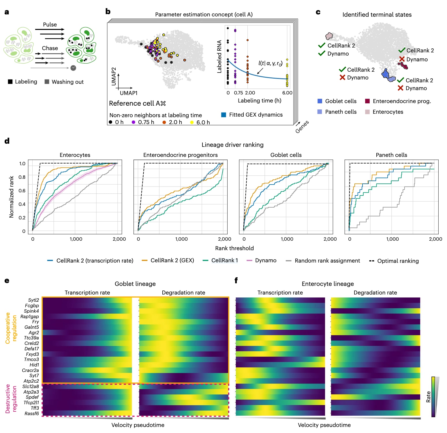 图5 | 通过代谢标记量化谱系特异性的调控策略。 **a,**在脉冲–追踪(pulse–chase)实验中对细胞进行代谢标记9,并在随后进行单细胞测序。脉冲实验通过将细胞置于含核苷类似物的培养基中不同时间,使新生 RNA 被标记;追踪实验则先让细胞在核苷类似物中长时间孵育,使细胞内 mRNA 完全掺入标记核苷,随后洗脱这些核苷并在不同时间点收集样本。**b,**对于每个细胞、每个基因以及每个标记时长,研究者寻找一个邻域,使其中包含预设数量、具有非零表达计数的细胞(示例为细胞 A)。随后利用该邻域细胞估计该细胞–基因组合的特异性转录速率 α 与降解速率 γ,以建模标记 mRNA 的动力学。**c,**UMAP 展示了使用 CellRank 2 与 dynamo 识别出的终末状态。绿色对勾表示该方法成功恢复了对应的终末状态;红色叉号表示未能识别。**d,**不同方法对各谱系驱动基因的排序结果。由于 dynamo 仅识别出肠细胞(enterocyte)为终末状态,因此只对该谱系产生基因排名。图中展示了 dynamo 的平均基因排名及其 95% 置信区间(方法)。**e,**杯状细胞(goblet)谱系中,已知高排名驱动因子的推断转录速率(左)与降解速率(右)。**f,**与 e 同理,但展示的是肠细胞(enterocyte)谱系的结果。