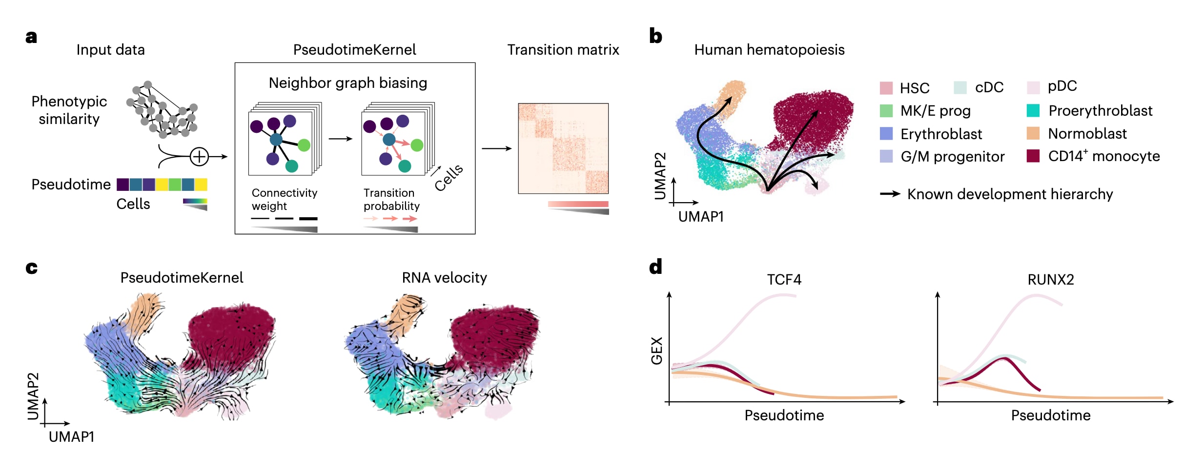 图2 | 展示了如何利用伪时间排序进行细胞命运映射。 a部分中,PseudotimeKernel将基于表型相似性的最近邻图中的边偏向于更高的伪时间方向,从而定义细胞间的转移概率。b与c部分为24,440个外周血单个核细胞的UMAP嵌入,按细胞类型着色(cDC;G/M progenitor,粒细胞/髓系祖细胞;HSC;MK/E prog,巨核/红系祖细胞;pDC)。b部分以黑色示意该体系已知的分化层级。c部分展示基于PseudotimeKernel所得的投影velocity场(左)以及基于RNA velocity的velocity场(右)。d部分展示利用命运概率与基因表达的相关性能够恢复pDC谱系的已知调控因子。图中按照此前工作所提出的方式,在伪时间(横轴)上拟合广义加性模型,显示基因表达(纵轴)的谱系特异趋势;每个细胞对各条谱系的贡献根据CellRank 2恢复的命运概率加权。颜色对应b部分中所示的不同谱系。