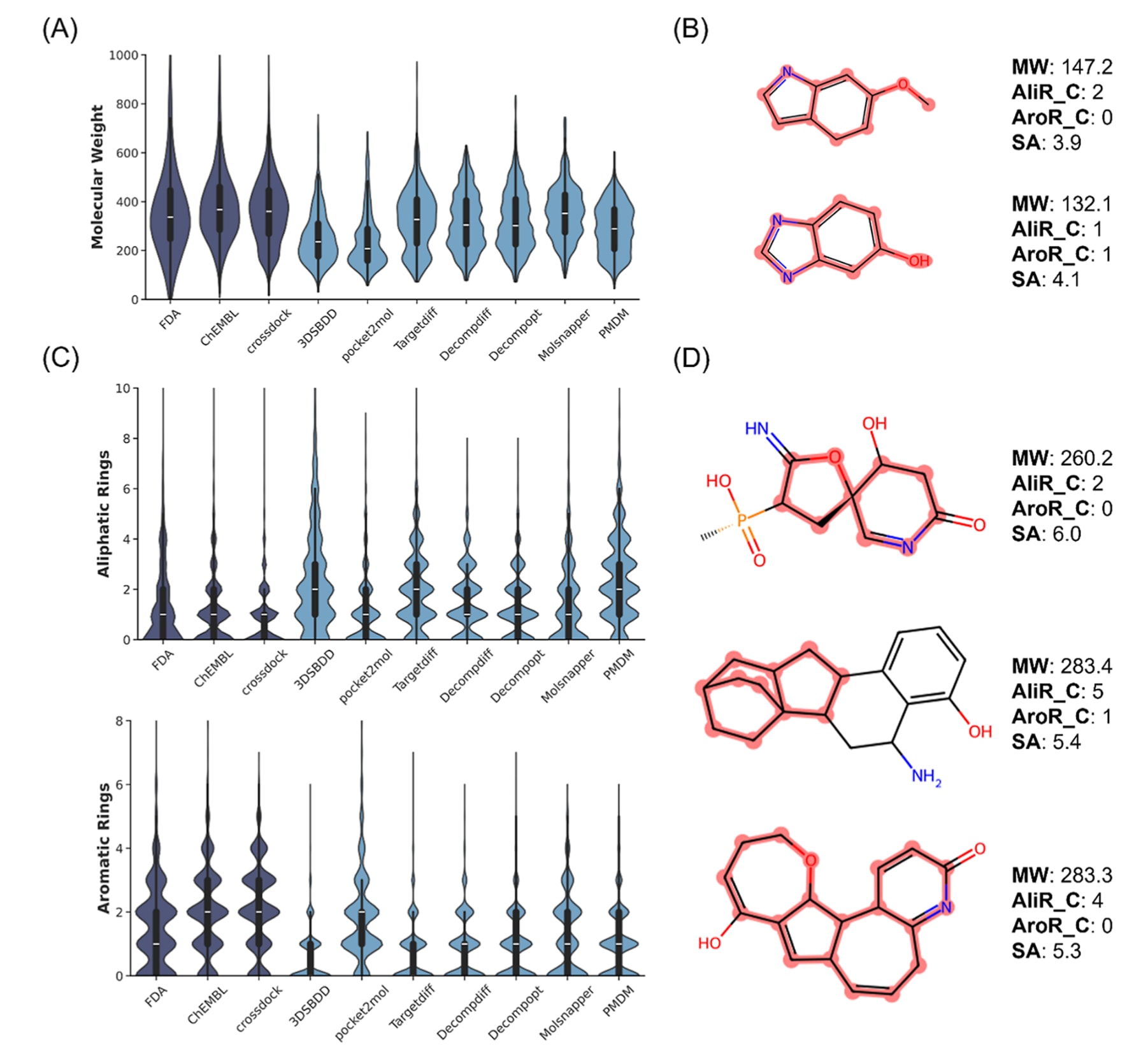 图5 | 展示了化学性质分布显示生成分子与对照数据集之间的差异。 对应的化学上不合理结构选自未通过 ChEMBL 环系评价指标的分子,并利用 RDKit 将与这些分布相关的子结构以红色标出。(A) 各数据集中分子量的分布。(B) 由 3DSBDD 或 pocket2mol 生成的、具有较低分子量的分子示例。(C) 各数据集中脂肪族环数量和芳香环数量的分布。(D) 具有多个脂肪族环且只有一个或没有芳香环的化学上不合理分子示例。