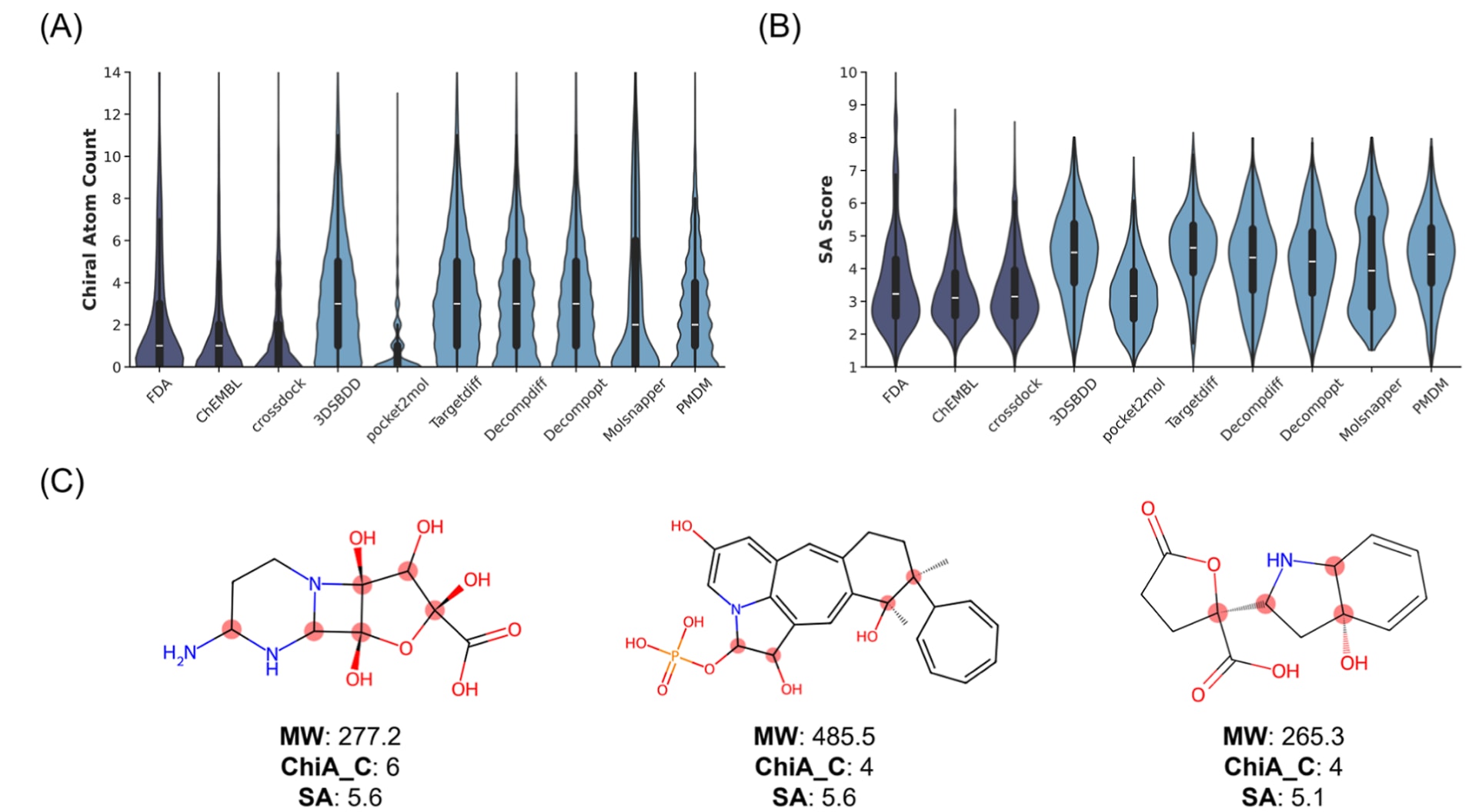 图6 | 展示了与结构复杂性相关的分布显示生成分子与对照数据集之间的差异。 对应的化学上不合理结构选自未通过 ChEMBL 环系评价指标的分子,并利用 RDKit 将与这些分布相关的子结构以红色标出。(A) 各数据集中手性原子数量和合成可及性(SA)评分的分布。(B) 具有多个手性原子的分子示例。