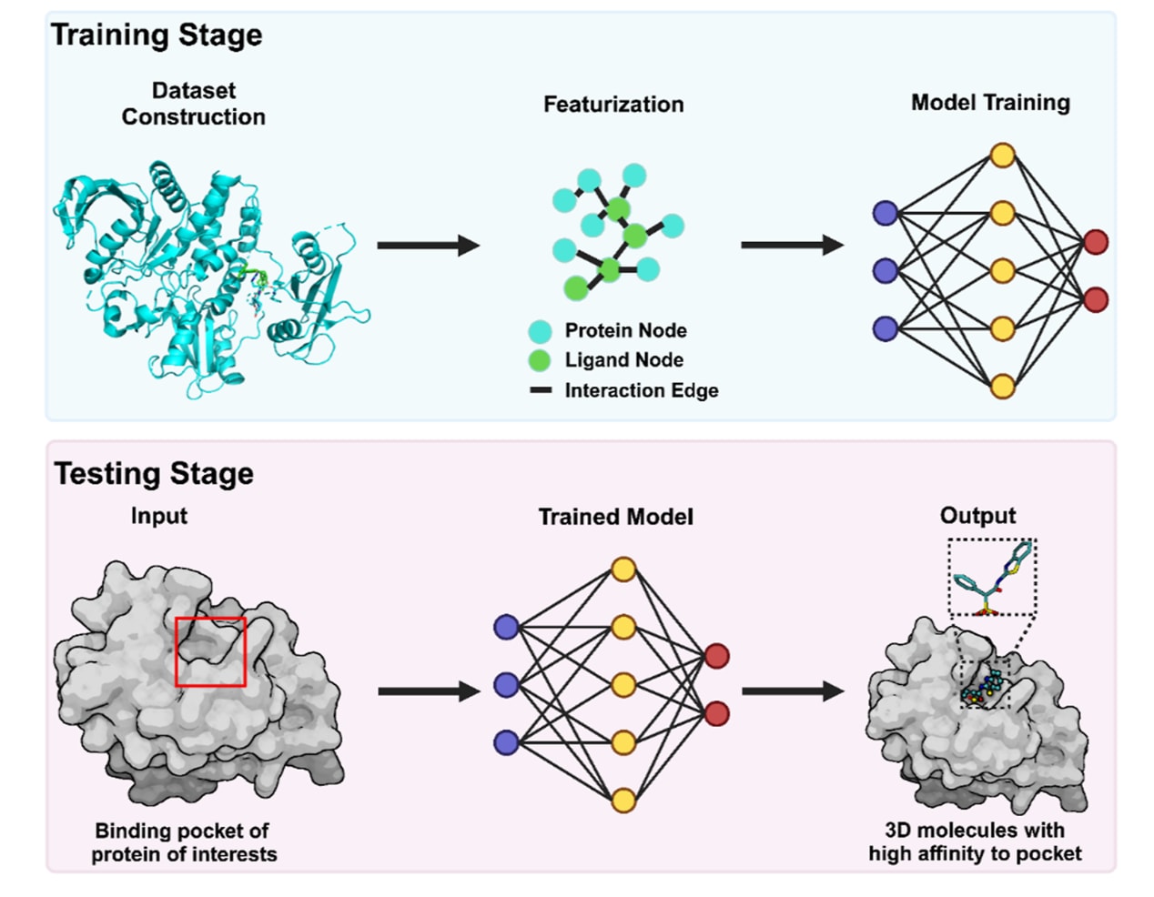 由于药物发现过程通常耗时且昂贵,人们一直在努力加速这一过程、降低相关成本并提高成功率。近年来,人工智能和机器学习(AI/ML)的快速发展推动了大量新方法应用于药物发现,其中生成式 AI 尤其引人关注。如果生成式 AI 能够直接依据治疗靶点的信息(如序列、结构和作用机制等)设计小分子候选药物,无疑将非常具有吸引力。然而,一个关键问题是:目前是否已经达到了这一水平?换句话说,研究人员是否已经能够直接将 AI 生成的分子用于临床前甚至临床阶段的研究?为此,该研究工作提出了两个新颖的指标,用于评估基于三维(3D)蛋白靶点结构生成的分子的化学合理性。一般而言,基于结构的生成模型会在训练过程中学习蛋白−配体相互作用的特征,然后针对预定义的三维结合口袋生成多个预期能够结合的小分子三维结构(图1)。