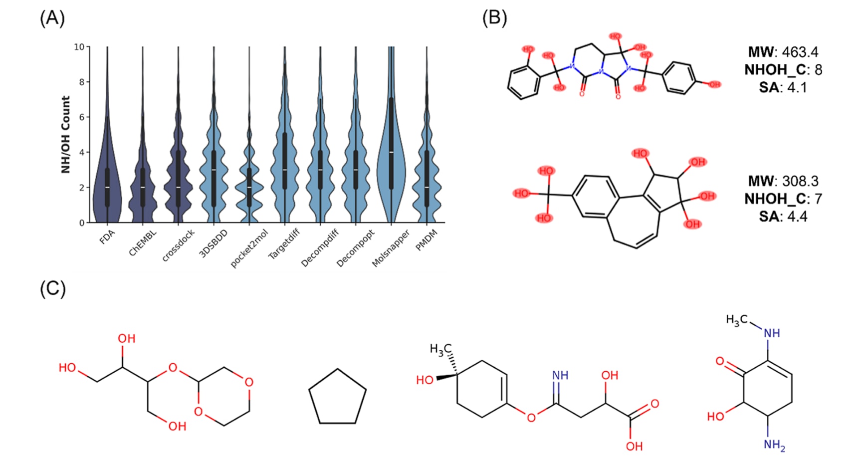 图7 | 展示了特定官能团的分布及示例分子。 (A) 各数据集中 NH 和 OH 基团数量的分布表明,这些算法更倾向于生成含有 NH 和 OH 基团的分子;与这些分布相关的子结构由 RDKit 以红色标出。(B) 含有多个 OH/NH 基团的分子示例。(C) 四个虽满足该研究所采用的全部三项评价指标,但仍然不具备良好药物性质或难以合成的分子示例。