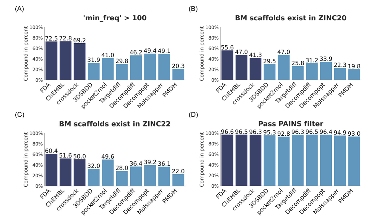 图3 | 展示了使用三项指标和 PAINS 过滤器评估的化合物比例。 (A) “min_freq > 100” 指标通过从每个分子中提取环系,并统计这些环系在 ChEMBL 数据库中出现的频率来计算。如果某个分子中最不常见的环系(单个分子可能包含多个环系)在 ChEMBL 中出现次数少于 100 次,则该分子被视为可能在化学上不稳定或缺乏类药性。该比例通过“满足该条件的分子数量”除以“包含环系的唯一分子总数”得到。(B, C) “BM scaffolds” 指标通过从 ZINC20 和 ZINC22 数据库中提取类药分子Bemis–Murcko 骨架来计算。如果生成分子的 BM 骨架未在这些数据库中出现,则可能意味着其结构合成难度较大或在化学上不够合理。该比例通过“在 ZINC 中出现的 BM 骨架数量”除以“生成分子中 BM 骨架的总数”得到。(D) 通过 PAINS 过滤器的分子所占比例。