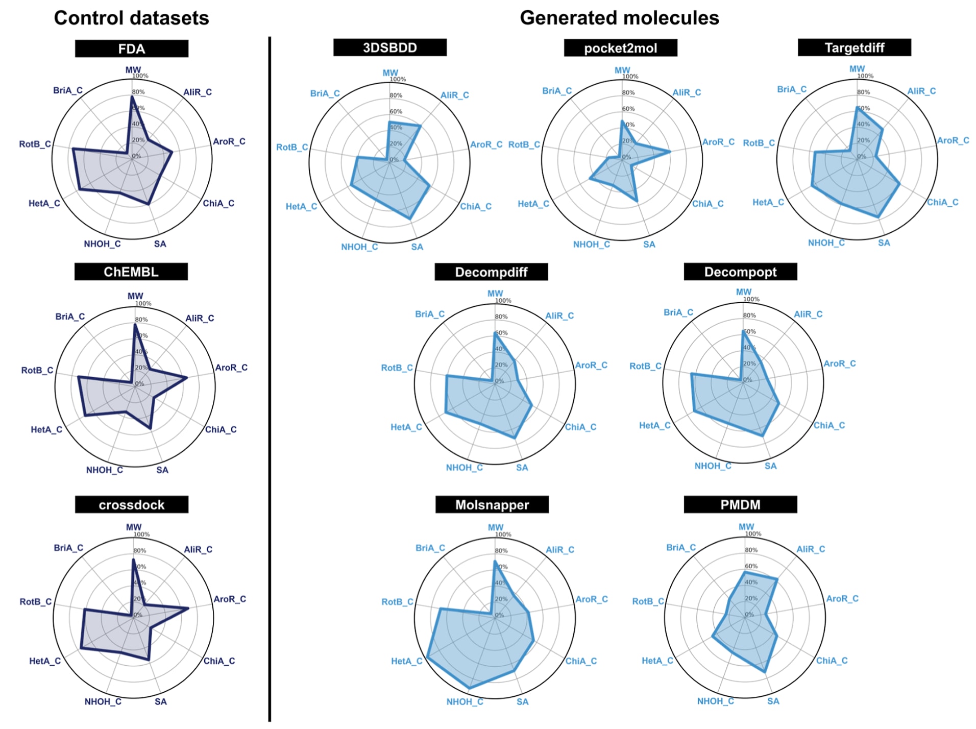 为评估生成算法在设计化学合理且类药分子方面的能力,该研究团队首先基于 ZINC20 和 ZINC22 数据库中的类药分子调查,提出了两个新的指标。随后,又结合一个基于 ChEMBL 数据库中环系出现频率的额外指标,对七种基于结构的生成算法(3D-Generative-SBDD,简称 3DSBDD;pocket2mol;TargetDiff;DecompDiff;PMDM;Decompopt;MolSnapper)所生成分子的化学合理性进行了系统评估,并将结果与三个对照组进行对比(经批准上市的小分子药物、处于临床阶段的 ChEMBL 小分子,以及被认为富含类药分子的 crossdock 数据集)。总体而言,研究发现这些生成模型产生的分子在类药性方面普遍劣于对照组,主要原因在于化学合理性和类药性均存在不足。进一步的性质分布分析与可视化结果揭示了一些潜在成因——这些差异可能源于训练数据集和模型架构。