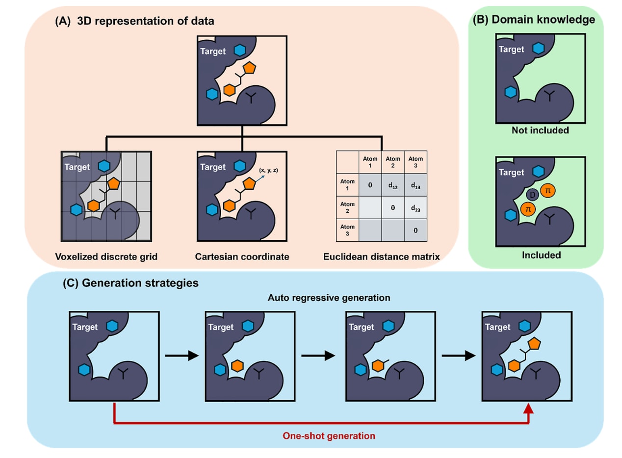 图2 | 展示了当前三维结构驱动小分子生成算法的概览。 (A) 配体和蛋白的三维结构可以用多种形式表示,包括体素化网格、笛卡尔坐标以及欧几里得距离矩阵。近期也有方法将三维数据离散化为“token”,以便利用大语言模型完成基于三维结构的生成任务。(B) 除了将蛋白结构作为分子生成的条件输入外,还可以引入药效团、蛋白–配体相互作用等领域知识,对生成过程进行约束和引导。(C) 这些模型还可按生成策略进行区分:一类采用自回归方式,按原子或片段逐步生成配体;另一类则采用“一步到位”的策略(如扩散模型),在单次生成过程中构建完整分子。