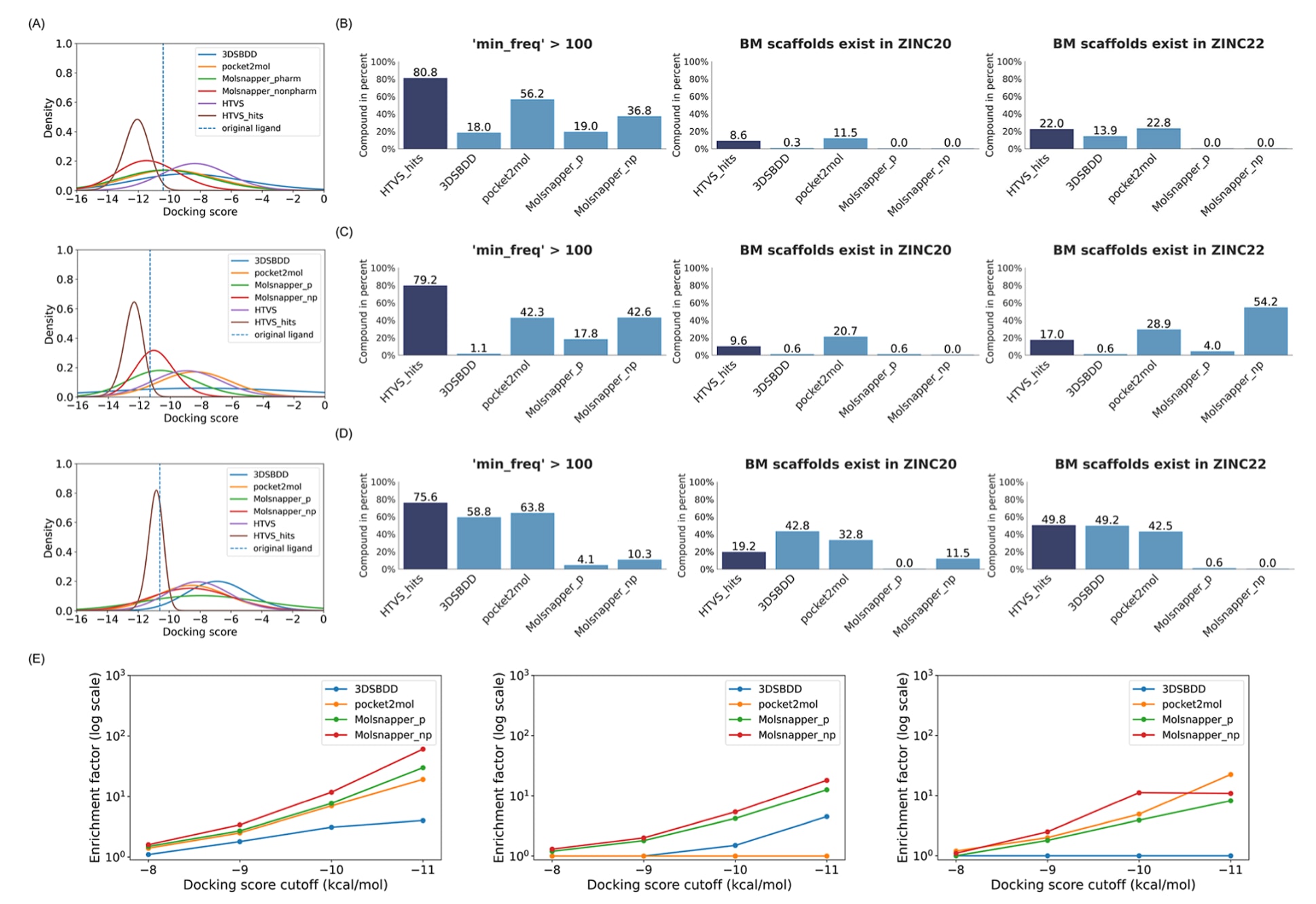 图8 | 展示了不同算法生成分子与针对 C-Src 激酶(PDB ID: 7WF5)、Smoothened 受体(PDB ID: 5L7I)和多巴胺 D1 受体(PDB ID: 7CKY)的高通量虚拟筛选(HTVS)命中分子的比较。 对于 MolSnapper,“p” 表示在生成过程中引入来自晶体配体的药效团信息,“np” 表示未使用药效团信息。行对应不同蛋白靶标:第一行为 7WF5,第二行为 5L7I,第三行为 7CKY。(A) 生成分子、Enamine HTS 文库的十分之一子集以及 HTVS 命中分子的 Vina 评分分布。(B–D) 满足三项质量控制指标的化合物比例:环频率 >100;Bemis–Murcko(BM)骨架存在于 ZINC20 中;BM 骨架存在于 ZINC22 中。对于该分析,使用按 Vina 评分排序后排名前 500 的 HTS 分子来计算通过率。(E) 生成分子相对于 Enamine HTS 文库十分之一子集的 Vina 评分富集因子(从左到右分别对应 7WF5、5L7I 和 7CKY)。