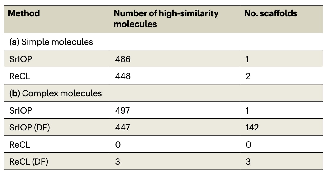 扩展数据表2显示,在最终阶段(SrIOP 4),SrIOP生成的骨架数量约为REINVENT的18倍(55个对3个)。此外,在相同500个采样分子中,SrIOP生成的满足奖励条件的分子更多(494对476)。扩展数据表2还给出了生成集合的内部多样性,以及生成分子中来自训练数据的比例。分子示例链接见“数据可用性”部分。