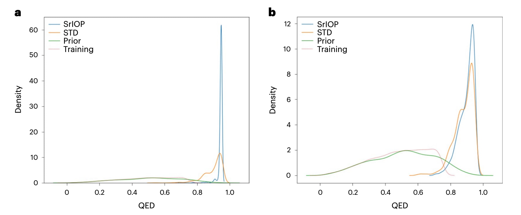 图3|SrIOP与REINVENT在有无多样性过滤条件下的比较 a,b展示SrIOP与REINVENT(STD)在未启用(a)与启用(b)多样性过滤情况下生成类药性分子时的对比。图中给出了高QED分子(QED > 0.90)的生成分布。训练过程中仅使用低QED分子(QED < 0.8),随后在每一步SrIOP迭代中逐步提升QED奖励区间。两种方法均能生成目标性质的分子,但在两种条件下SrIOP生成位于目标区间的分子数量更多。