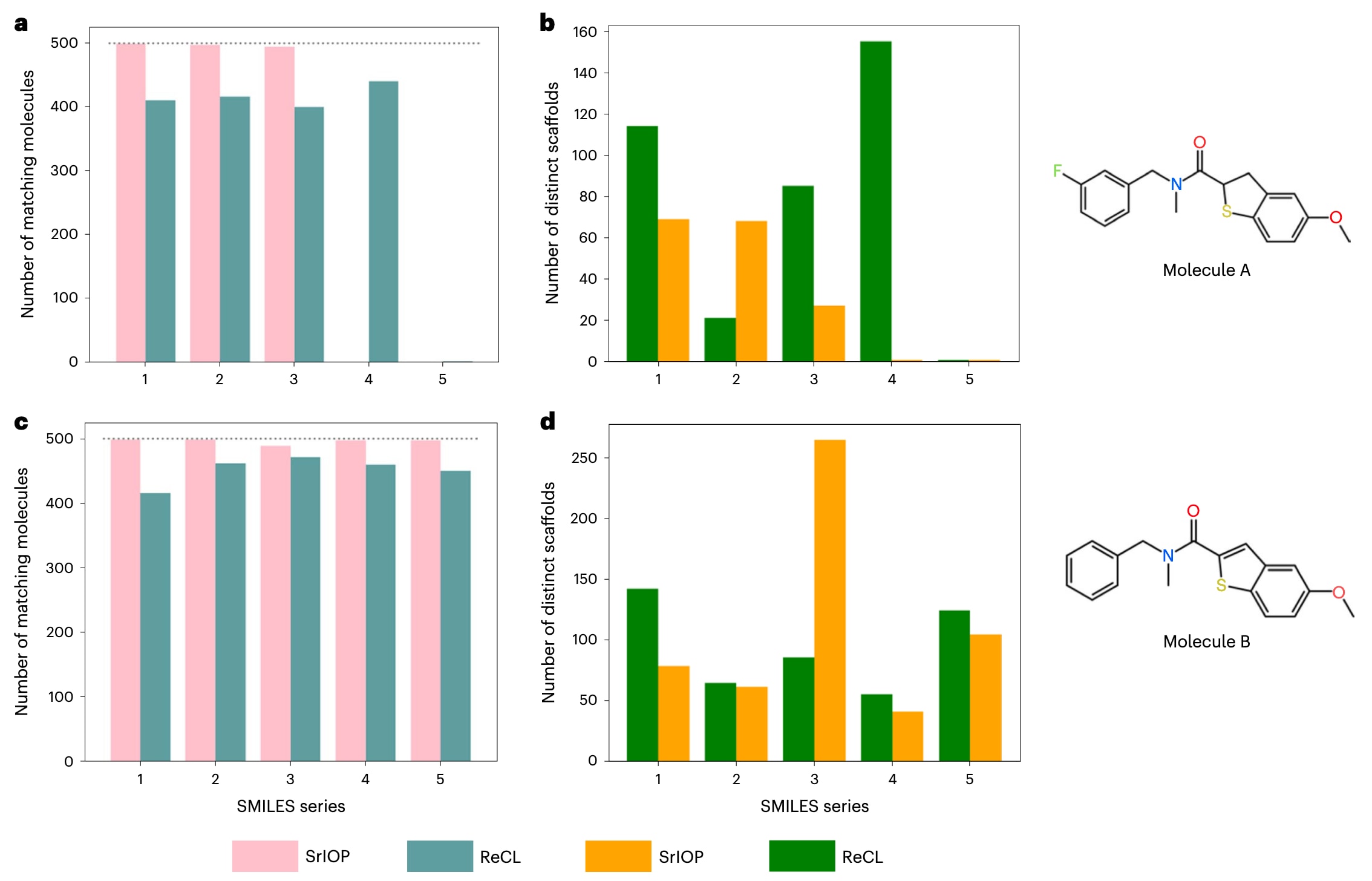 图4|SMILES选择对ReCL与SrIOP子结构生成性能的影响 a–d为每个目标分子生成的五组不同的中间SMILES,并在优化过程中使用。每一步使用的不同SMILES版本均代表同一分子。a,c显示最终代理生成的包含目标子结构的SMILES数量(共采样500个分子);b,d展示成功样本中不同骨架的数量。a,b与c,d分别对应目标分子A与B。图中可以看到,SMILES的选择会直接影响优化性能以及生成分子的多样性。例如,对于分子A,尽管各步骤的中间SMILES都代表完全相同的结构,两种方法仍至少各有一次未能生成目标子结构(即无任何分子包含所需子结构)。