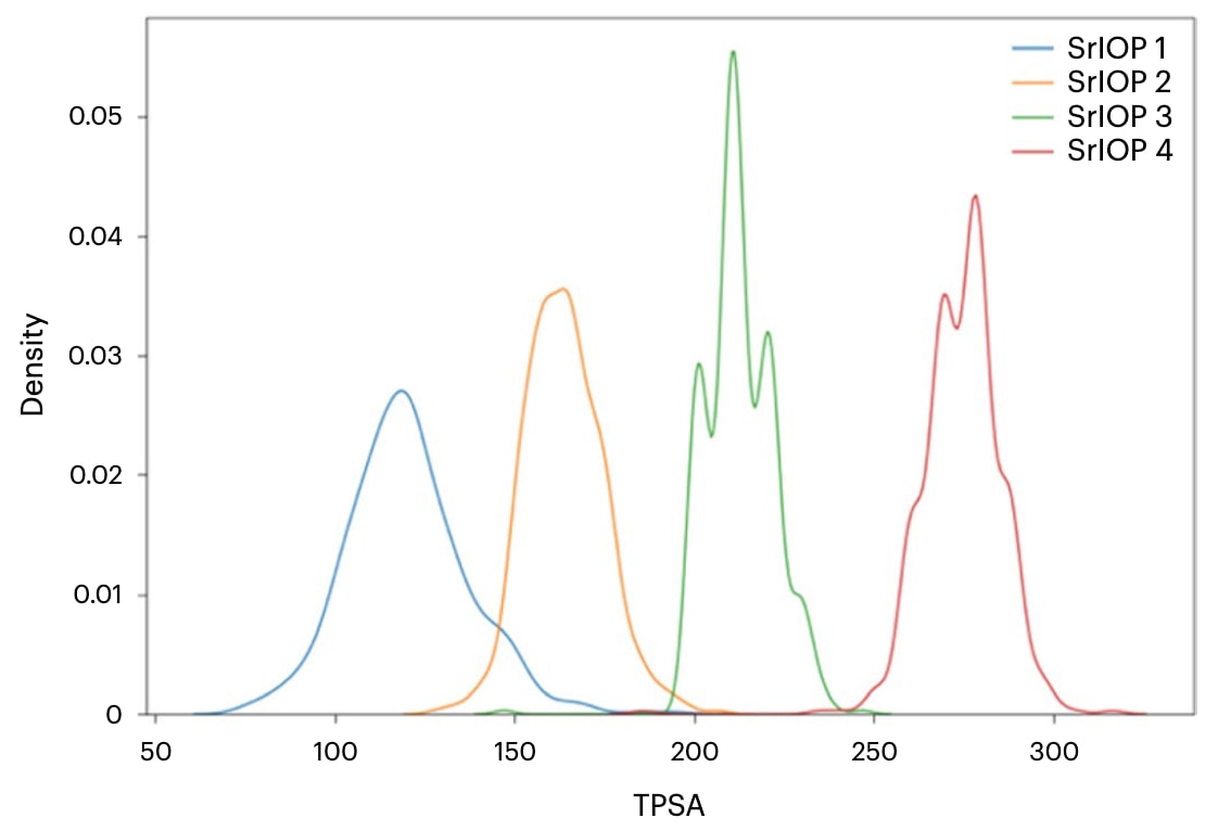 图2|分子TPSA分布 图中展示在rIOP流程中训练得到的各阶段代理(SrIOP 1–3)以及最终代理(SrIOP 4)所生成分子的TPSA分布。可以看到,TPSA分布在逐步迭代中不断向目标性质区间移动。各步骤对应的TPSA奖励范围为:100–150(SrIOP 1)、150–200(SrIOP 2)、200–250(SrIOP 3)以及250–300(SrIOP 4)。