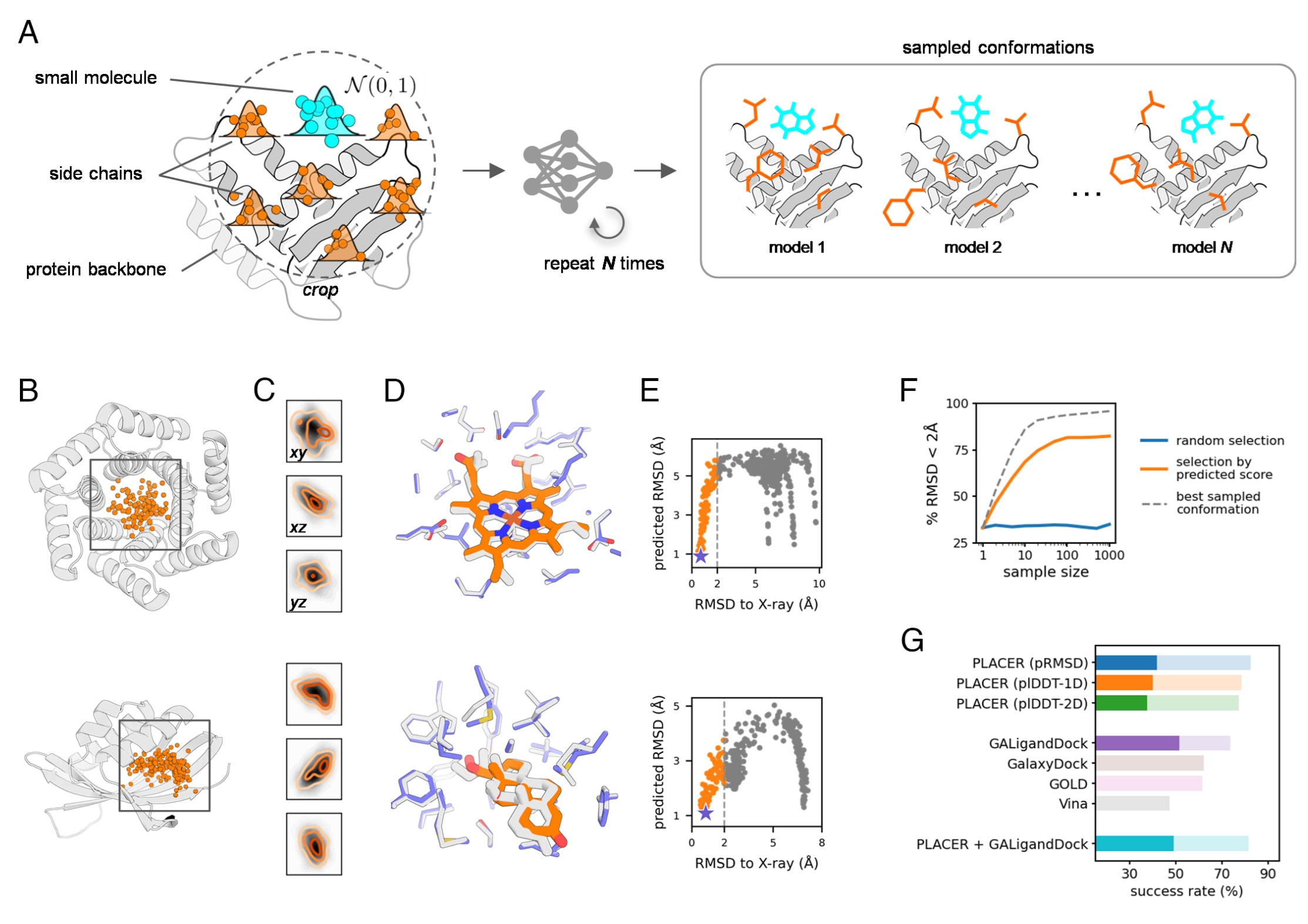 图3|展示了PLACER在蛋白–小分子相互作用建模中的应用。(A) 以蛋白主链结构为起点,并将小分子的坐标随机初始化在结合位点附近(青色点),PLACER能够预测蛋白侧链构象(初始随机化于各自Cα周围,橙色点)、以及小分子相对于蛋白的最终结构与位置。通过多次重复这一过程,PLACER可生成结构多样的对接构象集合。(B、C) 两个从头设计的小分子结合蛋白的示例,展示小分子的采样起始位置。C中为这些起始点在三个坐标平面上的投影,灰度代表起始点密度,橙色轮廓表示最终对接结果中配体RMSD < 2 Å的起始点密度。两者高度重叠,说明PLACER对配体在口袋中的初始放置并不敏感。(D) 具有最低pRMSD得分的构象(蓝/橙)与实验结构(灰)高度一致。(E) pRMSD得分更低的模型更接近天然构象,体现了该评分的判别力。(F) 增大采样规模并使用pRMSD重评分(橙色曲线)可显著提高选到优质模型的概率,优于随机选择(蓝色曲线),但仍未达到最优(灰色虚线)。(G) 在PLACER预测的三种精度指标中,pRMSD表现最佳(图顶部三条)。鲜色与浅色分别表示Astex非天然集合中配体RMSD < 1 Å与 < 2 Å的对接成功率。中间四条为常用对接工具Vina、GOLD、GalaxyDock与Rosetta GALigandDock的表现。使用PLACER采样并通过GALigandDock最小化与重评分,可在<1 Å阈值上比单独使用PLACER提升7.3%的成功率。
