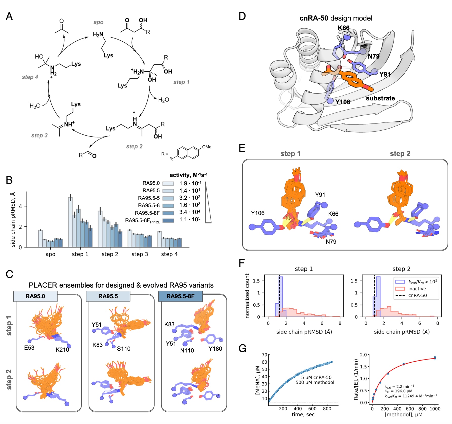 图4|展示了利用预组织催化残基筛选设计,可提升酶活性的结果。(A) 逆醛缩反应机制及其关键中间体。(B) 使用PLACER对RA95系列设计在与methodol反应时的五个中间态进行建模,用于评估活性位点赖氨酸及其修饰形式的预组织程度。(C) 三个已发表的逆醛缩酶设计的PLACER构象集合示例,随着酶活性提升,其在反应路径步骤1与步骤2中的预组织程度逐渐增强。(D) 最活跃变体cnRA-50的设计模型,其中催化四元体以蓝色标示,底物以橙色标示。(E) PLACER生成的cnRA-50在反应步骤1与步骤2中赖氨酸–methodol加成物的构象集合。(F) 利用PLACER评估活性位点预组织的指标(即不含主链的赖氨酸加成原子pRMSD),能够富集筛选出更高活性的从头设计逆醛缩酶。(G) cnRA-50催化逆醛缩反应的实验数据:左图为生成6-methoxy-2-naphthaldehyde的时间过程,右图为基于初速度获得的米氏曲线。