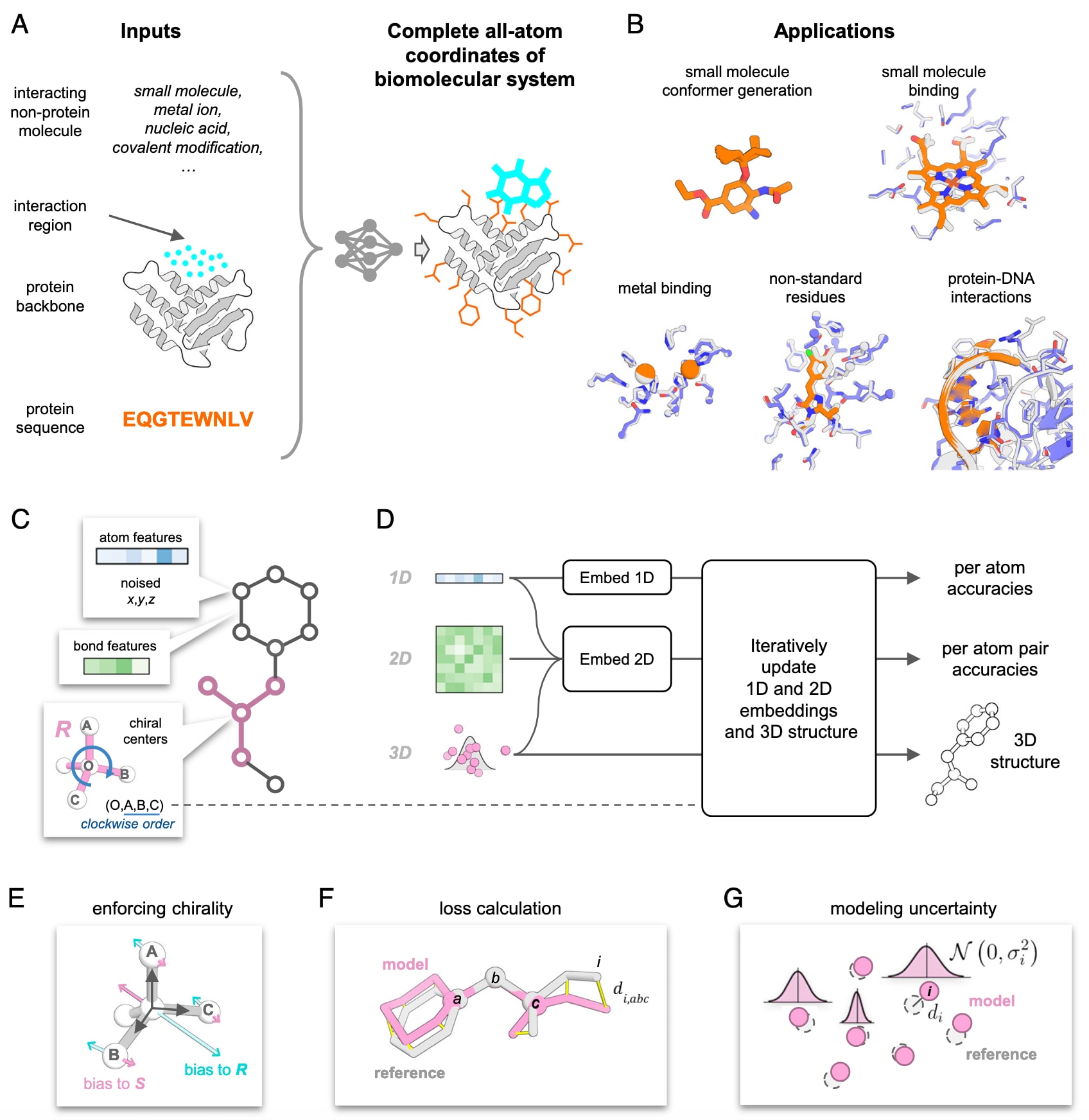 蛋白与核酸、小分子有机与无机化合物以及金属之间的相互作用对生命功能至关重要,但要在全原子尺度上准确建模这些相互作用及其构象异质性仍然十分困难。基于深度学习的小分子对接方法如DiffDock相较Glide与GNINA/SMINA有所提升,但在高精度任务上差异并不显著,并且在遇到未见过的受体时性能明显下降。同时,也有研究利用化学结构生成小分子的三维构象;在以半经验量子化学方法计算的GEOM-DRUGS训练集上,扩散生成模型展现出领先性能。然而,此类方法通常仅适用于特定类型的相互作用伙伴,输入特征也因分子类型不同而变化,限制了模型抽取通用物理化学规律的能力。