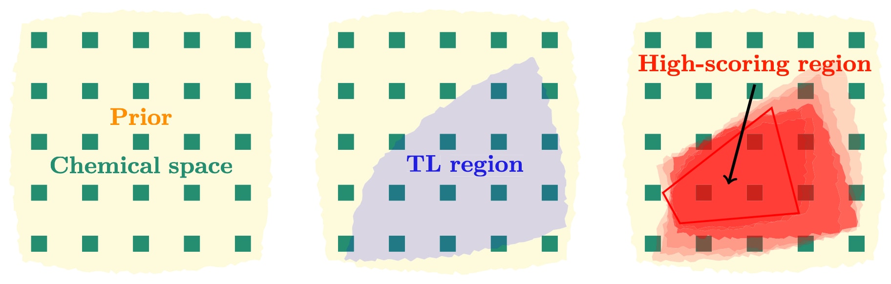 图1 | 该图示意了prior、迁移学习agent以及强化学习/分阶段学习agent的理想化行为。 在所有情况下,模型均描述了对某一token序列(对应特定分子,图中绿色方块)的采样概率,并以颜色深浅表示概率大小。prior经过训练后会提升对所有药物样分子的采样概率。由prior构建的迁移学习agent会在特定区域提高概率(图中蓝色,中间)。在分阶段学习中(红色,右侧),模型从迁移学习agent出发,通过迭代逐步提高对高评分序列的采样概率,使分布逐渐集中到高评分区域(红色多边形)。
