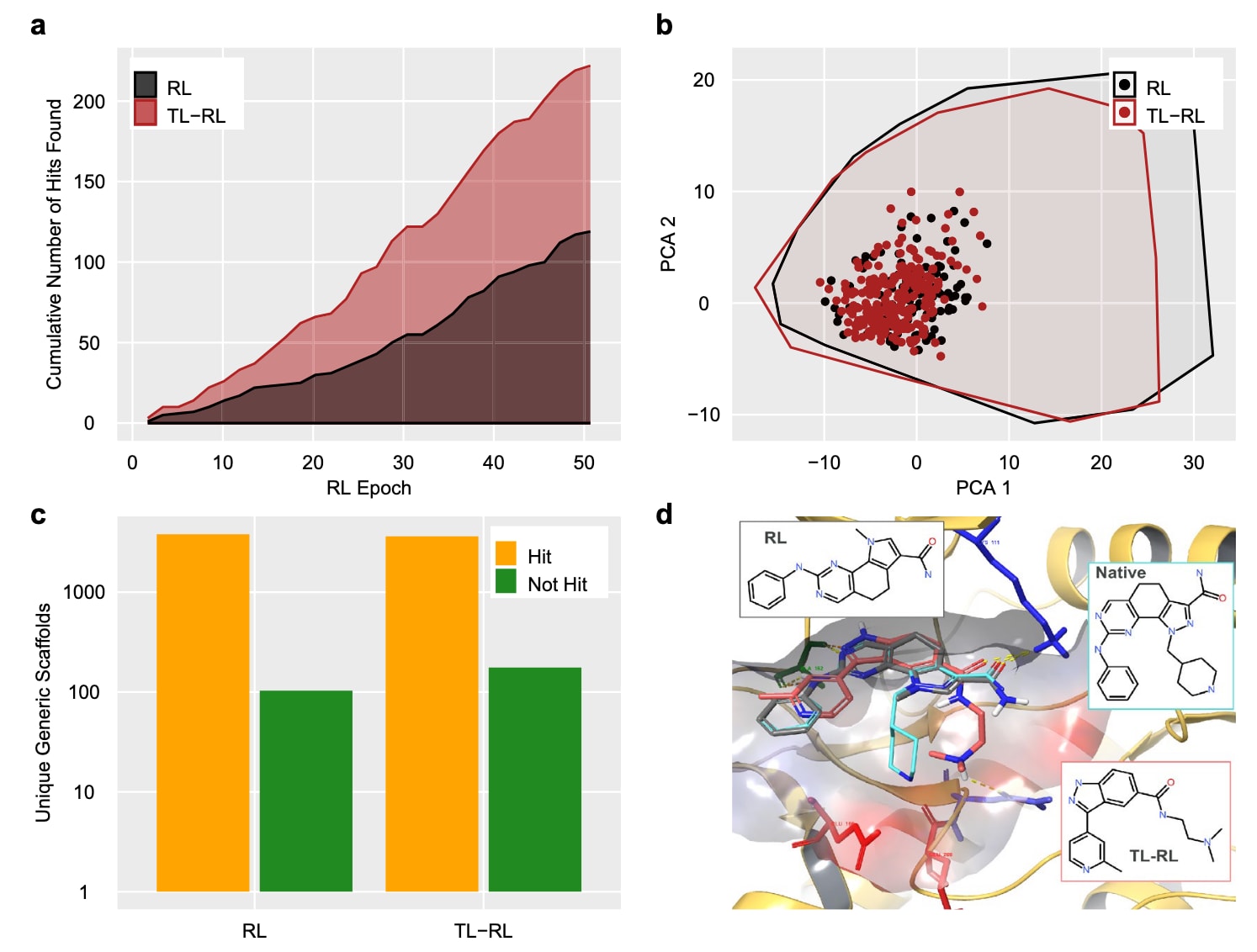 图5|展示了在REINVENT 4中利用PDK1晶体结构(PDB ID 2XCH)进行简单双靶点结构设计的示例。 (a)显示了在50个epoch中累计识别到的命中数量,其中黑色曲线对应从prior直接进行强化学习(RL),红色曲线对应经迁移学习后的强化学习(TL-RL)。结果表明TL-RL的命中累积速度更快。(b)通过基于RDKit二维描述符的主成分分析(PCA)比较了命中分子的多样性,图中命中以彩色圆点表示,同时给出了所有生成分子的凸包多边形,以体现结构空间覆盖范围。(c)统计了命中与未命中的独特通用骨架数量,用以进一步度量多样性。两种方法均展现出高骨架多样性。(d)展示了两种方法所得最高评分分子在PDK1结合口袋中的预测结合构象,并以stick形式表示,同时以青色展示天然配体作为对照。两者的对接得分均为−10.1 kcal/mol。蛋白以cartoon表示,关键氨基酸残基(ALA162绿色、LYS111蓝色、GLU166红色、GLU209红色、ASN210蓝色)以stick形式显示,并叠加透明的结合位点表面。图中右侧的二维插图展示了对应配体结构。命中定义为对接得分≤−8 kcal/mol且QED≥0.7的分子。
