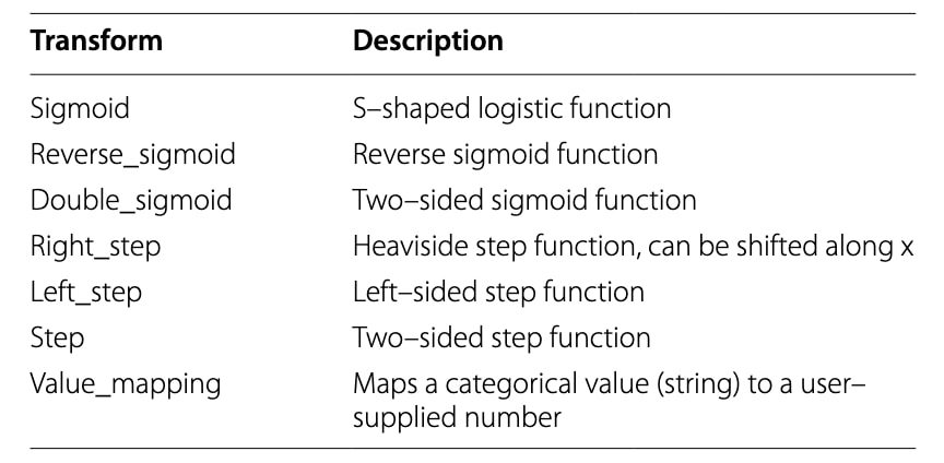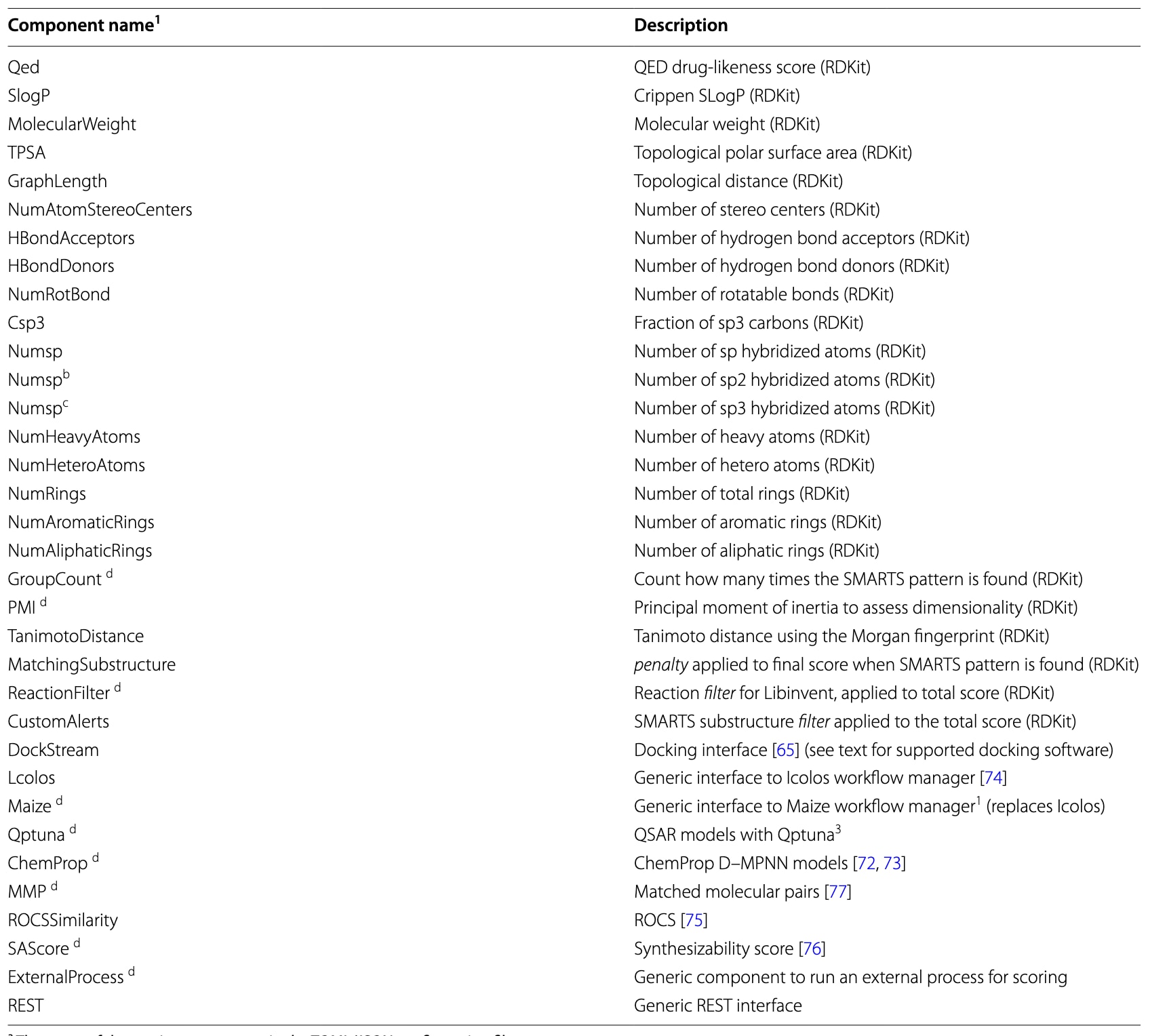 许多评分函数用于评估RDKit提供的理化性质,如Lipinski规则、QED等;LinkInvent还提供这些性质的片段版本,以便对生成的linker进行独立评分。对接则通过DockStream接口处理,支持AutoDock Vina、rDock、Hybrid、Glide与GOLD。QSAR模型由Qptuna处理,ChemProp提供基于D-MPNN的替代方案。更复杂的流程可通过ICOLOS构建,未来将被Maize取代。也提供REST接口用于调用外部评分程序,使用户可实现任意自定义评分逻辑;形状相似性可通过ROCS计算;可合成性可使用SA score评估;匹配分子对则可通过mmpdb使用。每个评分结果可通过转换函数压缩至0到1,转换方法列于表3;每个端点需设定权重以决定其相对重要性。最终,各组件评分将聚合为一个单一总分,目前支持加权算术平均与加权几何平均。评分子系统采用插件机制构建,只需将新代码按模板放入插件目录即可,无需修改REINVENT 4核心代码。
